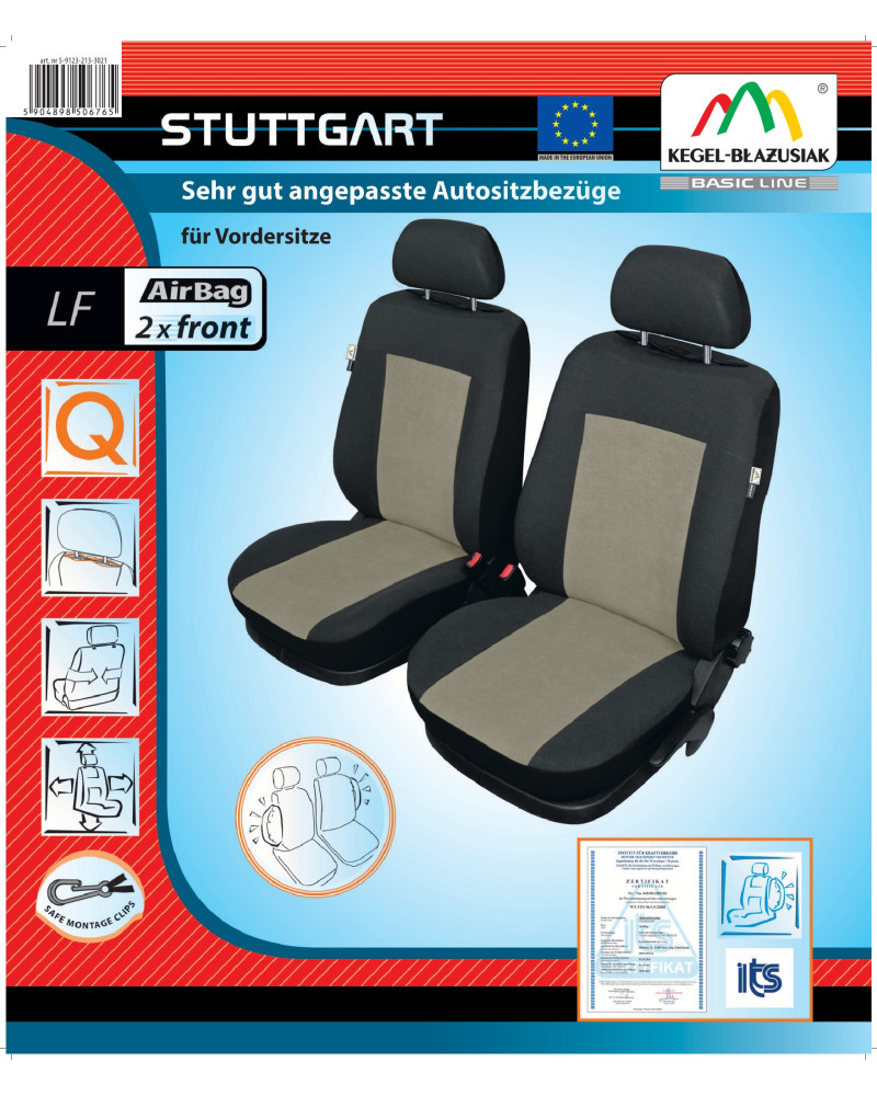 Univerzálne prispôsobené poťahy STUTTGART – dobre prispôsobené vybraným autosedadlám - bezpečné a okrem toho sa ešte vyznačujú vysoko atraktívnym vzhľadom. Sú zhotovené v klasickom štýle zo silného a stáleho čalúnnického materiálu podlaminovaného penou, vďaka ktorej dobre priliehajú k čalúneniu a ktorá zabraňuje posunu poťahov voči sedadlám. Poťahy sú vzadu úplne uzatvorené, čo umožňuje chrániť tiež zadnú časť sedačky. Pokiaľ chcete osviežiť interiér svojho automobilu, aby bol viac šik a dodať mu eleganciu, pokiaľ chcete ochrániť čalúnenie svojho auta - ste tu teda správne.