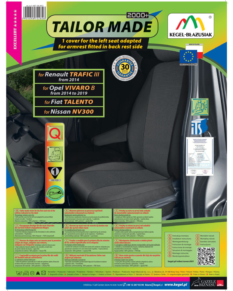 Ako už bolo uvedené predtým, predná i zadná časť poťahu sú ušité zo silného, pevného čalúnnického materiálu. Poťahy majú nevyhnutné, uzatvárateľné otvory, ktoré umožňujú ich natiahnutie bez nutnosti vyťahovať opierky hlavy a zhotovovať ďalšie otvory. Prednosťou poťahov TAILORE MADE je to, že kryjú celý zadný povrch operadla. Vďaka tejto vlastnosti vyzerajú veľmi dobre tiež zozadu sedačky a zároveň ju chránia pred znečistením a poškodením (to je dôležité predovšetkým pre osoby, ktoré majú malé deti). Komplet je vybavený špeciálnymi plastovými sponami, do materiálu sú všité pripevnenia, čo s pomocou priloženého obrázkového návodu na obsluhu zaisťuje veľmi ľahkú inštaláciu. Poťahy možno bez obáv prať na 40° – podľa pokynov na štítku. Výrobok renomovanej firmy Kegel-Błażusiak, najväčšieho výrobcu a exportéra v odvetví autopoťahov a pracovných odevov. Vyrobené v Poľsku, predovšetkým z poľských surovín, dodržaním všetkých kvalitatívnych štandardov Európskej únie. Nákupom poťahov Kegel-Błażusiak podporujete poľskú ekonomiku a chránite poľské pracovné miesta a tiež máte istotu, že si kupujete výrobok najvyššej kvality.