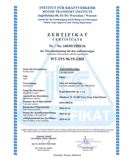 Bezpečnosť našich poťahov potvrdzuje certifikát a skúšky vykonané Inštitútom automobilovej dopravy.