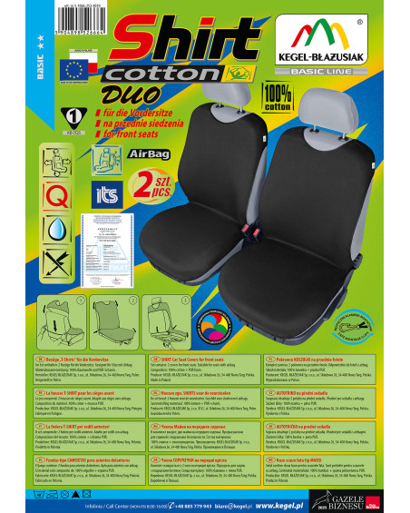 Autotričká SHIRT COTTON DUO boli vyrobené z vysoko kvalitného prírodného materiálu (100% bavlna), čo v kombinácii s starostlivosťou zakončenia aj tých najmenších detailov uspokojí aj tých najnáročnejších zákazníkov. Vďaka správnemu tvaru a inovatívnej konštrukcii sú poťahy veľmi dobre prispôsobené autosedadlám a dobre k nim priliehajú, podlaminovanie PUR penou po vnútornej strane celého materiálu zabraňuje ich posúvaniu. Zakrývajú celú úžitkovú časť sedadiel, vďaka tomu ich dobre chráni pred poškodením a znečistením. Nezakrývajú ale boky sedadiel, preto môžu byť bezpečne používané na sedadlách s airbagmi. Tričká chránia a zároveň zreteľne premenia autosedadlá a dodajú tak autu jedinečný charakter. Poťahy SHIRT COTTON DUO spĺňajú vysoké úžitkové normy, pretože veľmi dobre chránia originálne čalúnenie auta pred predratím, zničením, znečistením.