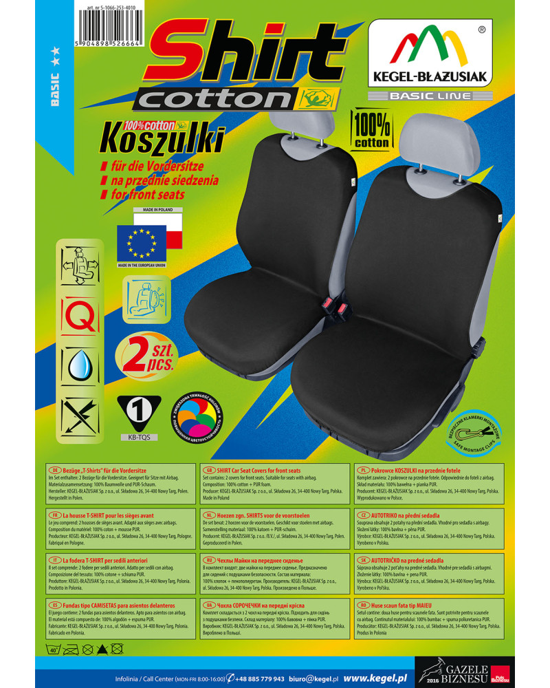 Ponuka cieli na majiteľov osobných automobilov, ktorí sa chcú postarať o interiér svojich vozidiel - ochrániť vlastné čalúnenie a obohatiť interiér auta o produkt vyznačujúci sa príjemným vzhľadom. Vďaka prírodnej bavlne z vrchnej strany sú poťahy veľmi príjemné a šetrné k pokožke, neelektrizujú. Okrem toho je bavlnený úplet farbený modernými metódami s pomocou farbív renomovaných výrobcov, vďaka tomu sa oproti iným produktom zhotoveným z bavlny vyznačuje zvýšenou odolnosťou voči strate farieb vplyvom slnka a v dôsledku prania. Poťah možno bez obáv prať v práčke na 40°- v súlade s informáciou na obale. Poťahy SHIRT COTTON tiež disponujú nevyhnutnými, správne veľkými, otvormi, ktoré umožňujú ich nasadenie bez nutnosti vyťahovať opierky hlavy a zhotovovať ďalšie otvory. Sada je vybavená špeciálnymi plastovými sponami a do materiálu sú všité pripevnenia, čo s pomocou priloženého obrázkového návodu na obsluhu zaisťuje veľmi ľahkú montáž.