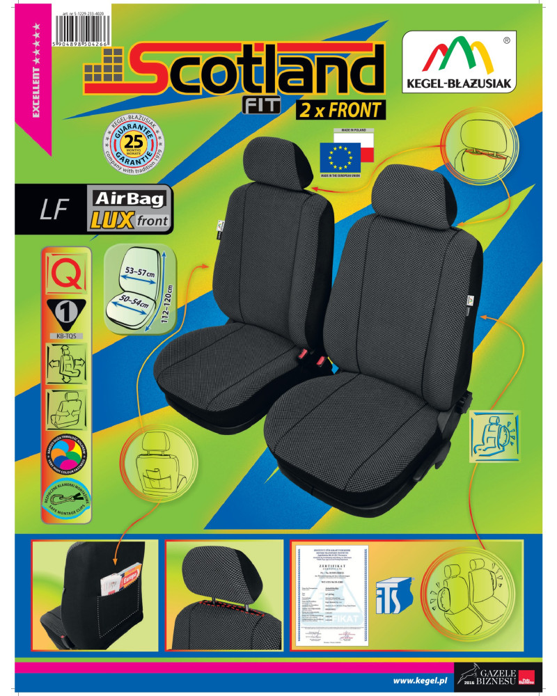 Prispôsobené poťahy SCOTLAND - zaisťujú užívateľom tak bezpečnosť , ako aj komfort používania. Sú ušité z najkvalitnejšieho silného a neľahko horľavého materiálu, vďaka čomu vyvolávajú jedinečné estetické dojmy a zároveň chránia čalúnenie vášho auta pred poškodením a znečistením. Čalúnnický materiál, z ktorého sú poťahy vyrobené, spĺňa najvyššie odolnostné normy - je silný, stály a neľahko horľavý. Udržujú si tmavú, zladenú farebnosť, skvele vyzerajú v interiéri každého vozidla. Vkusná, biela vzorka na čiernom materiáli pôsobí šik a elegantne. Vďaka inovatívnej konštrukcii a ušitiu na mieru sa poťahy dobre prispôsobia sedadlám uvedených modelov áut a vďaka laminovaniu PUR penou sa vyznačujú vysokou priľnavosťou. Obohaťte interiér svojho auta o výrobok najvyššej kvality. Nečakajte, starajte sa o interiér svojho vozidla už teraz! Poskytovaná záruka až 25 mesiacov vám dá istotu, že si kupujete výrobok najvyššej kvality.