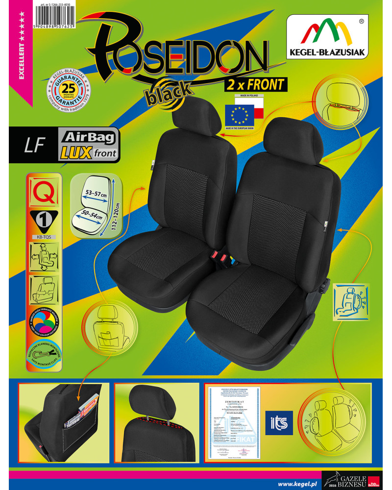 Prispôsobené poťahy POSEIDON - zaisťujú užívateľom tak bezpečnosť , ako aj komfort používania. Sú ušité z najkvalitnejšieho silného a neľahko horľavého materiálu, vďaka čomu vyvolávajú jedinečné estetické dojmy a zároveň chránia čalúnenie vášho auta pred poškodením a znečistením. Čalúnnický materiál, z ktorého sú poťahy vyrobené, spĺňa najvyššie odolnostné normy - je silný, stály a neľahko horľavý. Udržujú si tmavú, zladenú farebnosť, skvele vyzerajú v interiéri každého vozidla. Vďaka inovatívnej konštrukcii a ušitiu na mieru sa poťahy dobre prispôsobia sedadlám uvedených modelov áut a vďaka laminovaniu PUR penou sa vyznačujú vysokou priľnavosťou. Obohaťte interiér svojho auta o výrobok najvyššej kvality. Nečakajte, starajte sa o interiér svojho vozidla už teraz! Poskytovaná záruka až 25 mesiacov vám dá istotu, že si kupujete výrobok najvyššej kvality.