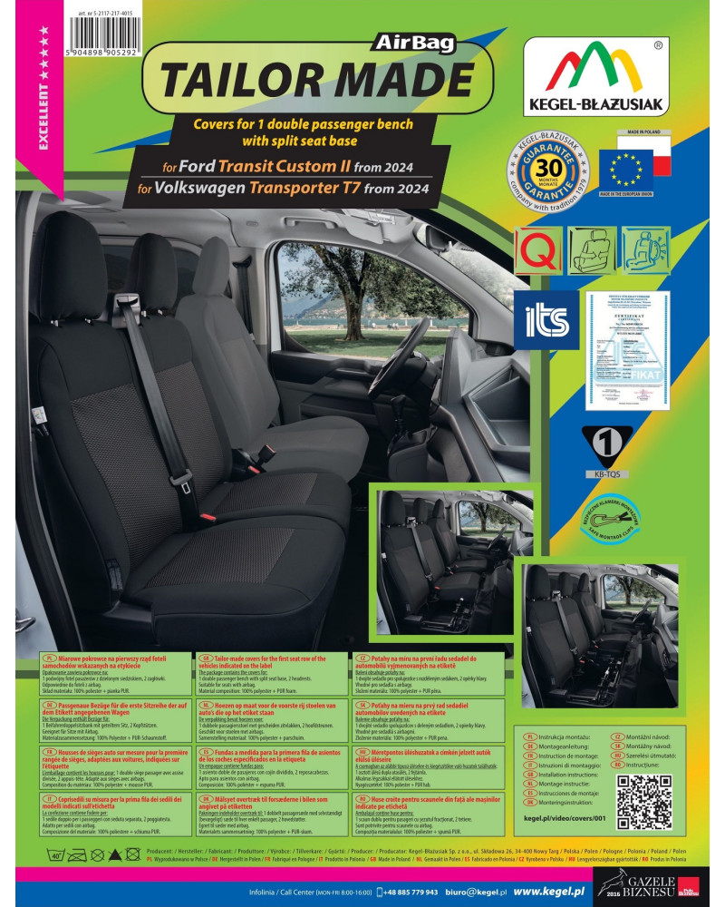 Ako už bolo uvedené predtým, predná i zadná časť poťahu sú ušité zo silného, pevného čalúnnického materiálu. Poťahy majú nevyhnutné, uzatvárateľné otvory, ktoré umožňujú ich natiahnutie bez nutnosti vyťahovať opierky hlavy a zhotovovať ďalšie otvory. Prednosťou poťahov TAILORE MADE je to, že kryjú celý zadný povrch operadla. Vďaka tejto vlastnosti vyzerajú veľmi dobre tiež zozadu sedačky a zároveň ju chránia pred znečistením a poškodením (to je dôležité predovšetkým pre osoby, ktoré majú malé deti). Komplet je vybavený špeciálnymi plastovými sponami, do materiálu sú všité pripevnenia, čo s pomocou priloženého obrázkového návodu na obsluhu zaisťuje veľmi ľahkú inštaláciu. Poťahy možno bez obáv prať na 40° – podľa pokynov na štítku. Výrobok renomovanej firmy Kegel-Błażusiak, najväčšieho výrobcu a exportéra v odvetví autopoťahov a pracovných odevov. Vyrobené v Poľsku, predovšetkým z poľských surovín, dodržaním všetkých kvalitatívnych štandardov Európskej únie. Nákupom poťahov Kegel-Błażusiak podporujete poľskú ekonomiku a chránite poľské pracovné miesta a tiež máte istotu, že si kupujete výrobok najvyššej kvality.