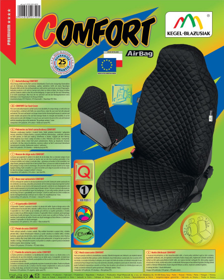 Poťah COMFORT to je jedinečná kombinácia prírodnej bavlnenej látky s klimatizačnými zriasenými vláknami, vďaka tomu je poťah skutočne silný a k tomu mäkký a pružný. Užívateľovi umožňuje pohodlne sa do neho ponoriť a cesta je vďaka tomu príjemnejšia. Materiál sa vyznačuje vysokou, takmer 100% stálosťou farby a odolnosťou voči odfarbeniu, predratiu, blednutiu. Je silný, pevný a odolný a zároveň veľmi jemný na dotyk, skoro ako čistá bavlna. Poťah zaisťuje efektívnu izoláciu - v lete sa len slabo zahrieva a v lete izoluje pred chladom. Poťah COMFORT efektívne chráni sedadlo pred poškodením a pred znečistením. Poťah veľmi dobre plní svoju ochrannú funkciu, pretože kryje celé sedadlo spoločne s bokmi a opierkou hlavy. Ochrana opierky hlavy je spojená s celým poťahom, vďaka tomu sedadlo po nasadení vyzerá skvele a takmer ako sedadlo v lietadle. Zaisťuje bezpečnosť, pretože je prispôsobený pre sedadlá s bočnými airbagmi. Môže byť použitý tak na sedadlách vodiča, ako aj spolujazdca, pretože bezpečný šev, ktorý sa roztrhne počas vystrelenia airbagu, je všitý tak na ľavej, ako aj na pravej strane. Poťah je vyrobený v univerzálnej veľkosti, vďaka tomu sa hodí na väčšinu štandardných auto sedadiel. Produkt sa veľmi ľahko inštaluje a čistí.