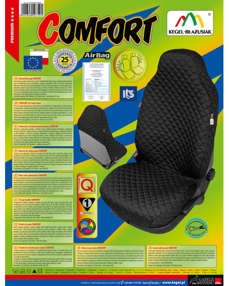 Poťah COMFORT to je jedinečná kombinácia prírodnej bavlnenej látky s klimatizačnými zriasenými vláknami, vďaka tomu je poťah skutočne silný a k tomu mäkký a pružný. Užívateľovi umožňuje pohodlne sa do neho ponoriť a cesta je vďaka tomu príjemnejšia. Materiál sa vyznačuje vysokou, takmer 100% stálosťou farby a odolnosťou voči odfarbeniu, predratiu, blednutiu. Je silný, pevný a odolný a zároveň veľmi jemný na dotyk, skoro ako čistá bavlna. Poťah zaisťuje efektívnu izoláciu - v lete sa len slabo zahrieva a v lete izoluje pred chladom. Poťah COMFORT efektívne chráni sedadlo pred poškodením a pred znečistením. Poťah veľmi dobre plní svoju ochrannú funkciu, pretože kryje celé sedadlo spoločne s bokmi a opierkou hlavy. Ochrana opierky hlavy je spojená s celým poťahom, vďaka tomu sedadlo po nasadení vyzerá skvele a takmer ako sedadlo v lietadle. Zaisťuje bezpečnosť, pretože je prispôsobený pre sedadlá s bočnými airbagmi. Môže byť použitý tak na sedadlách vodiča, ako aj spolujazdca, pretože bezpečný šev, ktorý sa roztrhne počas vystrelenia airbagu, je všitý tak na ľavej, ako aj na pravej strane. Poťah je vyrobený v univerzálnej veľkosti, vďaka tomu sa hodí na väčšinu štandardných auto sedadiel. Produkt sa veľmi ľahko inštaluje a čistí.
