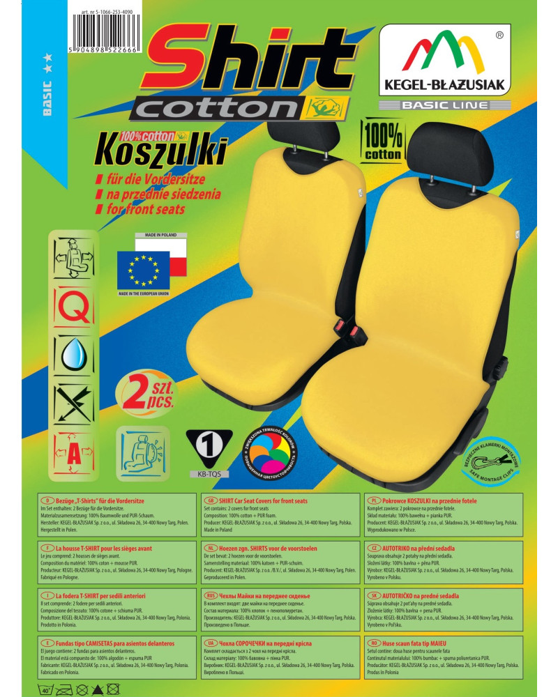 Autotričká SHIRT COTTON boli vyrobené z vysoko kvalitného prírodného materiálu (100% bavlna), čo v kombinácii s starostlivosťou zakončenia aj tých najmenších detailov uspokojí aj tých najnáročnejších zákazníkov. Vďaka správnemu tvaru a inovatívnej konštrukcii sú poťahy veľmi dobre prispôsobené autosedadlám a dobre k nim priliehajú, podlaminovanie PUR penou po vnútornej strane celého materiálu zabraňuje ich posúvaniu. Zakrývajú celú úžitkovú časť sedadiel, vďaka tomu ich dobre chráni pred poškodením a znečistením. Nezakrývajú ale boky sedadiel, preto môžu byť bezpečne používané na sedadlách s airbagmi. Tričká chránia a zároveň zreteľne premenia autosedadlá a dodajú tak autu jedinečný charakter. Poťahy SHIRT COTTON spĺňajú vysoké úžitkové normy, pretože veľmi dobre chránia originálne čalúnenie auta pred predratím, zničením, znečistením.