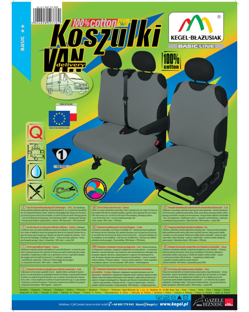 Tričká COTTON DV (Delivery Van) sú univerzálne poťahy určené pre dodávky, vyrobené zo 100% bavlny – vysoko kvalitného prírodného materiálu. Profesionálne prevedenie, starostlivosť o detaily a perfektný vzhľad sú schopné uspokojiť aj tých najnáročnejších zákazníkov. Vďaka vhodnej konštrukcii poťahy dobre priliehajú k sedadlám a podlaminovanie celého materiálu na vnútornej strane PUR penou zabraňuje ich posúvaniu. Tričká sa hodia na takmer každé autosedadlo. Veľmi ľahko sa nasadzujú a rýchlo sťahujú. Veľmi jednoducho sa tiež čistia. Poťahy predávame ako komplety - súčasťou sady je jeden poťah na predné sedadlo a jeden na sedadlo pre dvoch spolujazdcov. Samostatne si možno dokúpiť tiež poťahy na opierky hlavy. Autotričká sa tešia medzi zákazníkmi neustálemu záujmu. Chránia a zároveň veľmi zreteľne premenia autosedadlá a dodajú tak autu jedinečný charakter.