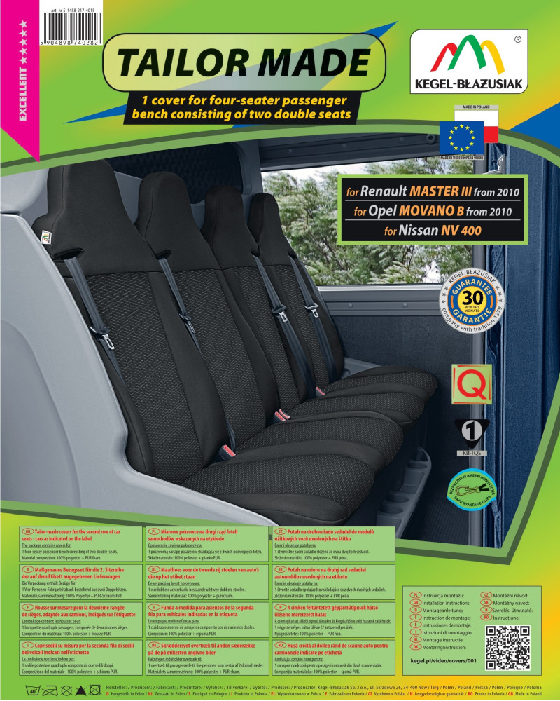 Ako už bolo uvedené predtým, predná i zadná časť poťahu sú ušité zo silného, pevného čalúnnického materiálu. Poťahy majú nevyhnutné, uzatvárateľné otvory, ktoré umožňujú ich natiahnutie bez nutnosti vyťahovať opierky hlavy a zhotovovať ďalšie otvory. Prednosťou poťahov TAILORE MADE je to, že kryjú celý zadný povrch operadla. Vďaka tejto vlastnosti vyzerajú veľmi dobre tiež zozadu sedačky a zároveň ju chránia pred znečistením a poškodením (to je dôležité predovšetkým pre osoby, ktoré majú malé deti). Komplet je vybavený špeciálnymi plastovými sponami, do materiálu sú všité pripevnenia, čo s pomocou priloženého obrázkového návodu na obsluhu zaisťuje veľmi ľahkú inštaláciu. Poťahy možno bez obáv prať na 40° – podľa pokynov na štítku. Výrobok renomovanej firmy Kegel-Błażusiak, najväčšieho výrobcu a exportéra v odvetví autopoťahov a pracovných odevov. Vyrobené v Poľsku, predovšetkým z poľských surovín, dodržaním všetkých kvalitatívnych štandardov Európskej únie. Nákupom poťahov Kegel-Błażusiak podporujete poľskú ekonomiku a chránite poľské pracovné miesta a tiež máte istotu, že si kupujete výrobok najvyššej kvality.