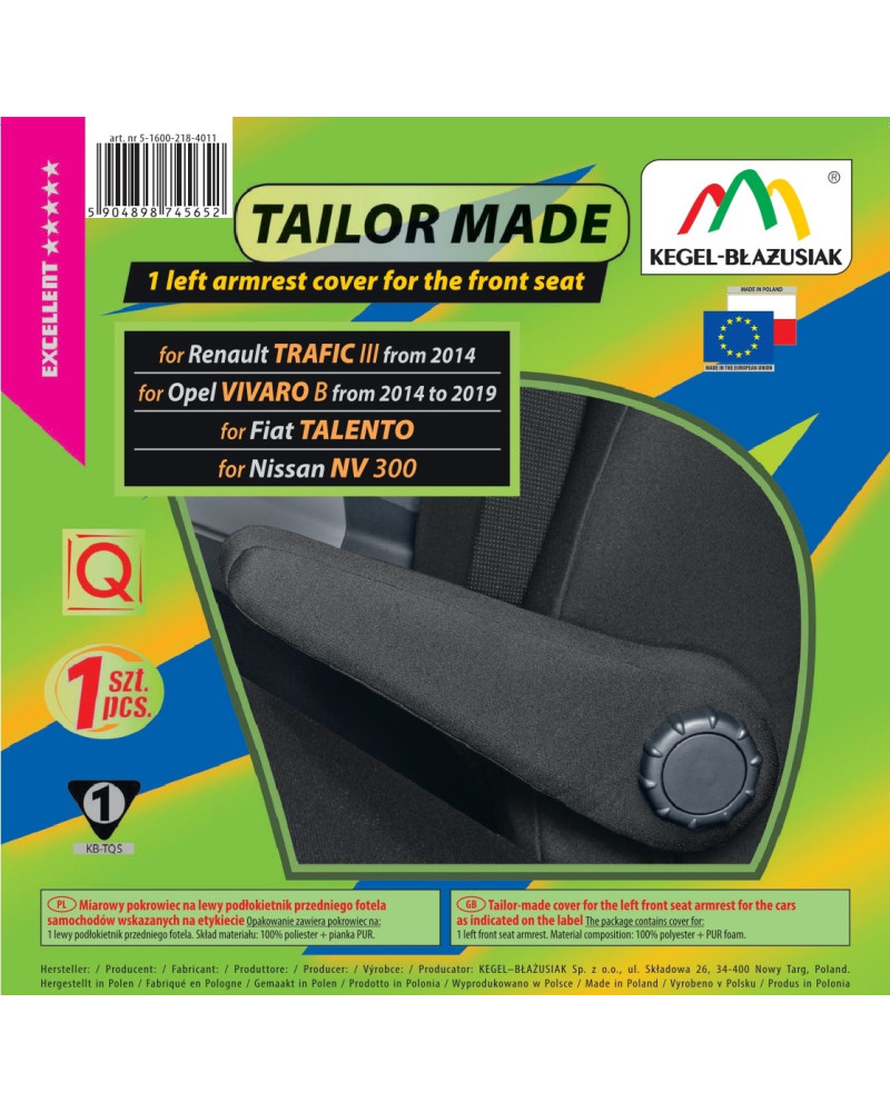 Ako už bolo uvedené predtým, predná i zadná časť poťahu sú ušité zo silného, pevného čalúnnického materiálu. Poťahy majú nevyhnutné, uzatvárateľné otvory, ktoré umožňujú ich natiahnutie bez nutnosti vyťahovať opierky hlavy a zhotovovať ďalšie otvory. Prednosťou poťahov TAILORE MADE je to, že kryjú celý zadný povrch operadla. Vďaka tejto vlastnosti vyzerajú veľmi dobre tiež zozadu sedačky a zároveň ju chránia pred znečistením a poškodením (to je dôležité predovšetkým pre osoby, ktoré majú malé deti). Komplet je vybavený špeciálnymi plastovými sponami, do materiálu sú všité pripevnenia, čo s pomocou priloženého obrázkového návodu na obsluhu zaisťuje veľmi ľahkú inštaláciu. Poťahy možno bez obáv prať na 40° – podľa pokynov na štítku. Výrobok renomovanej firmy Kegel-Błażusiak, najväčšieho výrobcu a exportéra v odvetví autopoťahov a pracovných odevov. Vyrobené v Poľsku, predovšetkým z poľských surovín, dodržaním všetkých kvalitatívnych štandardov Európskej únie. Nákupom poťahov Kegel-Błażusiak podporujete poľskú ekonomiku a chránite poľské pracovné miesta a tiež máte istotu, že si kupujete výrobok najvyššej kvality.