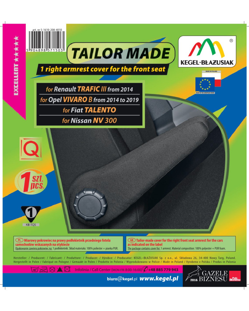 Ako už bolo uvedené predtým, predná i zadná časť poťahu sú ušité zo silného, pevného čalúnnického materiálu. Poťahy majú nevyhnutné, uzatvárateľné otvory, ktoré umožňujú ich natiahnutie bez nutnosti vyťahovať opierky hlavy a zhotovovať ďalšie otvory. Prednosťou poťahov TAILORE MADE je to, že kryjú celý zadný povrch operadla. Vďaka tejto vlastnosti vyzerajú veľmi dobre tiež zozadu sedačky a zároveň ju chránia pred znečistením a poškodením (to je dôležité predovšetkým pre osoby, ktoré majú malé deti). Komplet je vybavený špeciálnymi plastovými sponami, do materiálu sú všité pripevnenia, čo s pomocou priloženého obrázkového návodu na obsluhu zaisťuje veľmi ľahkú inštaláciu. Poťahy možno bez obáv prať na 40° – podľa pokynov na štítku. Výrobok renomovanej firmy Kegel-Błażusiak, najväčšieho výrobcu a exportéra v odvetví autopoťahov a pracovných odevov. Vyrobené v Poľsku, predovšetkým z poľských surovín, dodržaním všetkých kvalitatívnych štandardov Európskej únie. Nákupom poťahov Kegel-Błażusiak podporujete poľskú ekonomiku a chránite poľské pracovné miesta a tiež máte istotu, že si kupujete výrobok najvyššej kvality.