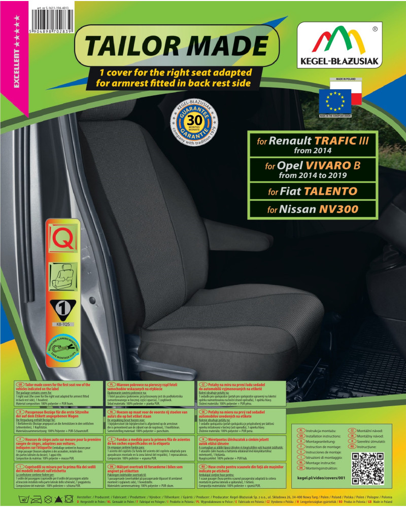 Ako už bolo uvedené predtým, predná i zadná časť poťahu sú ušité zo silného, pevného čalúnnického materiálu. Poťahy majú nevyhnutné, uzatvárateľné otvory, ktoré umožňujú ich natiahnutie bez nutnosti vyťahovať opierky hlavy a zhotovovať ďalšie otvory. Prednosťou poťahov TAILORE MADE je to, že kryjú celý zadný povrch operadla. Vďaka tejto vlastnosti vyzerajú veľmi dobre tiež zozadu sedačky a zároveň ju chránia pred znečistením a poškodením (to je dôležité predovšetkým pre osoby, ktoré majú malé deti). Komplet je vybavený špeciálnymi plastovými sponami, do materiálu sú všité pripevnenia, čo s pomocou priloženého obrázkového návodu na obsluhu zaisťuje veľmi ľahkú inštaláciu. Poťahy možno bez obáv prať na 40° – podľa pokynov na štítku. Výrobok renomovanej firmy Kegel-Błażusiak, najväčšieho výrobcu a exportéra v odvetví autopoťahov a pracovných odevov. Vyrobené v Poľsku, predovšetkým z poľských surovín, dodržaním všetkých kvalitatívnych štandardov Európskej únie. Nákupom poťahov Kegel-Błażusiak podporujete poľskú ekonomiku a chránite poľské pracovné miesta a tiež máte istotu, že si kupujete výrobok najvyššej kvality.