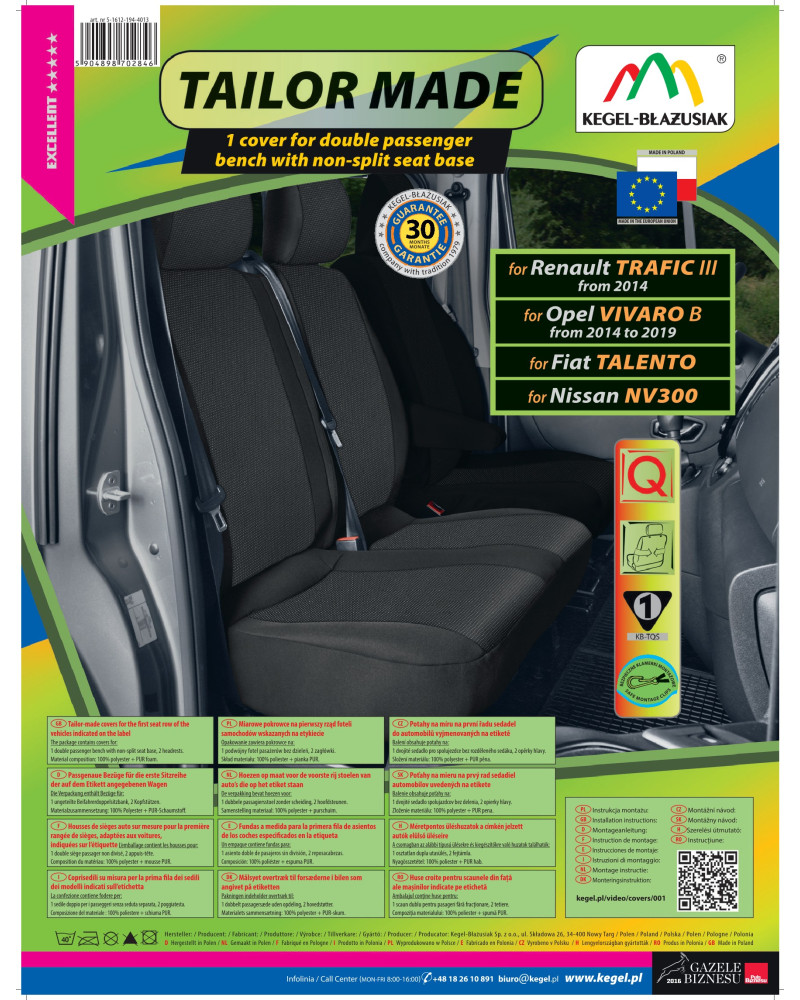 Ako už bolo uvedené predtým, predná i zadná časť poťahu sú ušité zo silného, pevného čalúnnického materiálu. Poťahy majú nevyhnutné, uzatvárateľné otvory, ktoré umožňujú ich natiahnutie bez nutnosti vyťahovať opierky hlavy a zhotovovať ďalšie otvory. Prednosťou poťahov TAILORE MADE je to, že kryjú celý zadný povrch operadla. Vďaka tejto vlastnosti vyzerajú veľmi dobre tiež zozadu sedačky a zároveň ju chránia pred znečistením a poškodením (to je dôležité predovšetkým pre osoby, ktoré majú malé deti). Komplet je vybavený špeciálnymi plastovými sponami, do materiálu sú všité pripevnenia, čo s pomocou priloženého obrázkového návodu na obsluhu zaisťuje veľmi ľahkú inštaláciu. Poťahy možno bez obáv prať na 40° – podľa pokynov na štítku. Výrobok renomovanej firmy Kegel-Błażusiak, najväčšieho výrobcu a exportéra v odvetví autopoťahov a pracovných odevov. Vyrobené v Poľsku, predovšetkým z poľských surovín, dodržaním všetkých kvalitatívnych štandardov Európskej únie. Nákupom poťahov Kegel-Błażusiak podporujete poľskú ekonomiku a chránite poľské pracovné miesta a tiež máte istotu, že si kupujete výrobok najvyššej kvality.