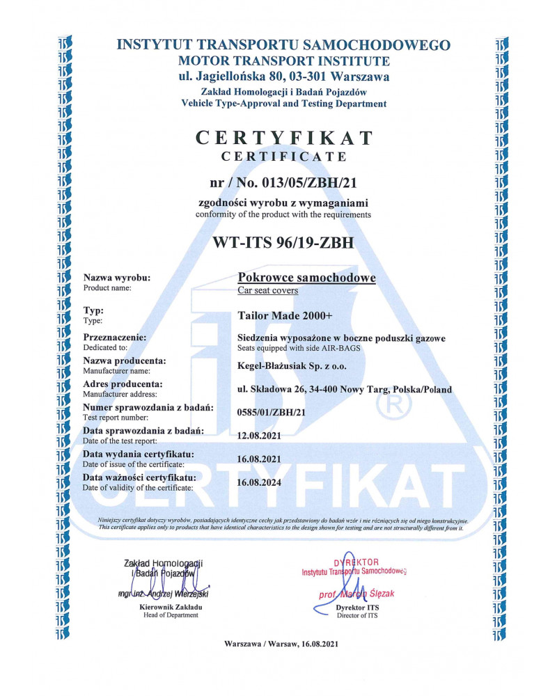 Bezpečnosť našich poťahov potvrdzuje certifikát a skúšky vykonané Inštitútom automobilovej dopravy.