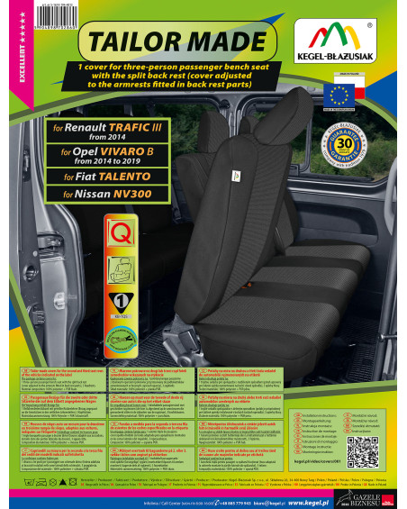Ako už bolo uvedené predtým, predná i zadná časť poťahu sú ušité zo silného, pevného čalúnnického materiálu. Poťahy majú nevyhnutné, uzatvárateľné otvory, ktoré umožňujú ich natiahnutie bez nutnosti vyťahovať opierky hlavy a zhotovovať ďalšie otvory. Prednosťou poťahov TAILORE MADE je to, že kryjú celý zadný povrch operadla. Vďaka tejto vlastnosti vyzerajú veľmi dobre tiež zozadu sedačky a zároveň ju chránia pred znečistením a poškodením (to je dôležité predovšetkým pre osoby, ktoré majú malé deti). Komplet je vybavený špeciálnymi plastovými sponami, do materiálu sú všité pripevnenia, čo s pomocou priloženého obrázkového návodu na obsluhu zaisťuje veľmi ľahkú inštaláciu. Poťahy možno bez obáv prať na 40° – podľa pokynov na štítku. Výrobok renomovanej firmy Kegel-Błażusiak, najväčšieho výrobcu a exportéra v odvetví autopoťahov a pracovných odevov. Vyrobené v Poľsku, predovšetkým z poľských surovín, dodržaním všetkých kvalitatívnych štandardov Európskej únie. Nákupom poťahov Kegel-Błażusiak podporujete poľskú ekonomiku a chránite poľské pracovné miesta a tiež máte istotu, že si kupujete výrobok najvyššej kvality.