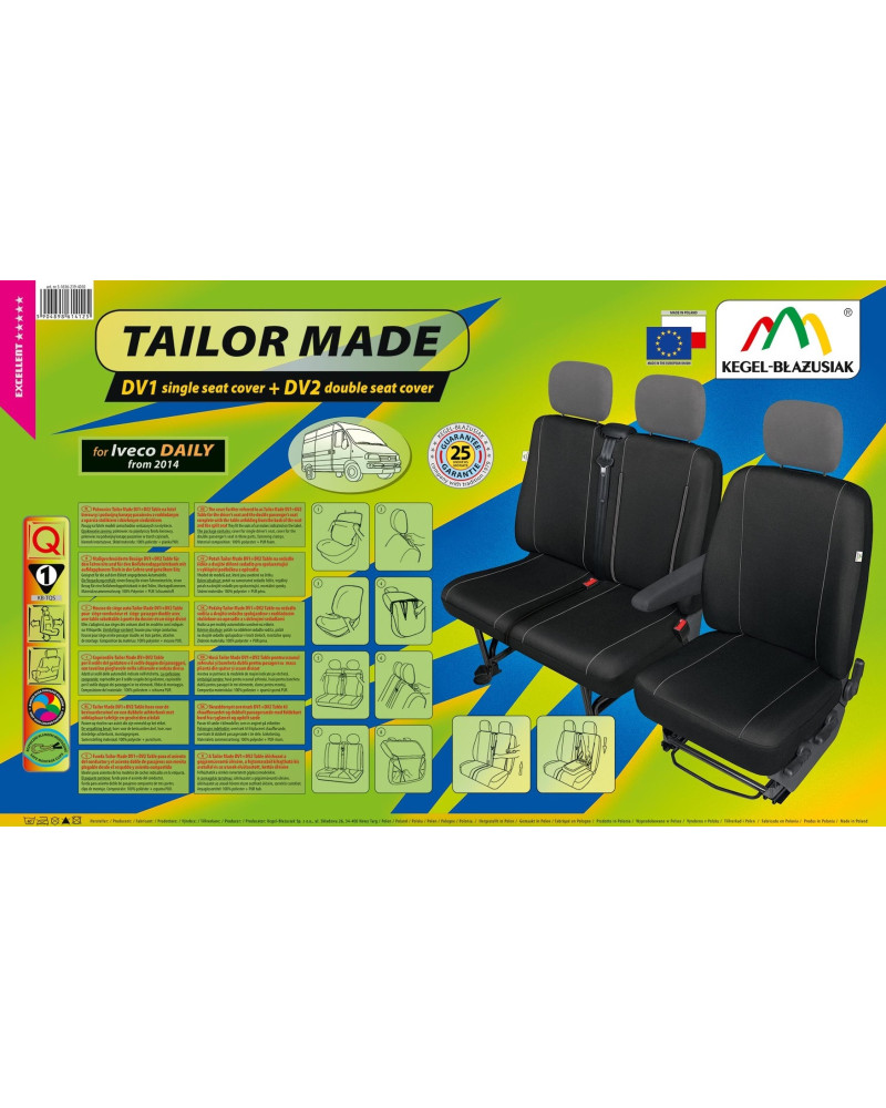 Ako už bolo uvedené predtým, predná i zadná časť poťahu sú ušité zo silného, pevného čalúnnického materiálu. Poťahy majú nevyhnutné, uzatvárateľné otvory, ktoré umožňujú ich natiahnutie bez nutnosti vyťahovať opierky hlavy a zhotovovať ďalšie otvory. Prednosťou poťahov TAILORE MADE je to, že kryjú celý zadný povrch operadla. Vďaka tejto vlastnosti vyzerajú veľmi dobre tiež zozadu sedačky a zároveň ju chránia pred znečistením a poškodením (to je dôležité predovšetkým pre osoby, ktoré majú malé deti). Komplet je vybavený špeciálnymi plastovými sponami, do materiálu sú všité pripevnenia, čo s pomocou priloženého obrázkového návodu na obsluhu zaisťuje veľmi ľahkú inštaláciu. Poťahy možno bez obáv prať na 40° – podľa pokynov na štítku. Výrobok renomovanej firmy Kegel-Błażusiak, najväčšieho výrobcu a exportéra v odvetví autopoťahov a pracovných odevov. Vyrobené v Poľsku, predovšetkým z poľských surovín, dodržaním všetkých kvalitatívnych štandardov Európskej únie. Nákupom poťahov Kegel-Błażusiak podporujete poľskú ekonomiku a chránite poľské pracovné miesta a tiež máte istotu, že si kupujete výrobok najvyššej kvality.