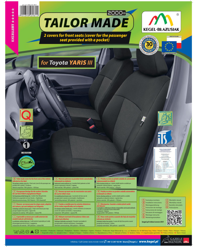Ako už bolo uvedené predtým, predná i zadná časť poťahu sú ušité zo silného, pevného čalúnnického materiálu. Poťahy majú nevyhnutné, uzatvárateľné otvory, ktoré umožňujú ich natiahnutie bez nutnosti vyťahovať opierky hlavy a zhotovovať ďalšie otvory. Prednosťou poťahov TAILORE MADE je to, že kryjú celý zadný povrch operadla. Vďaka tejto vlastnosti vyzerajú veľmi dobre tiež zozadu sedačky a zároveň ju chránia pred znečistením a poškodením (to je dôležité predovšetkým pre osoby, ktoré majú malé deti). Komplet je vybavený špeciálnymi plastovými sponami, do materiálu sú všité pripevnenia, čo s pomocou priloženého obrázkového návodu na obsluhu zaisťuje veľmi ľahkú inštaláciu. Poťahy možno bez obáv prať na 40° – podľa pokynov na štítku. Výrobok renomovanej firmy Kegel-Błażusiak, najväčšieho výrobcu a exportéra v odvetví autopoťahov a pracovných odevov. Vyrobené v Poľsku, predovšetkým z poľských surovín, dodržaním všetkých kvalitatívnych štandardov Európskej únie. Nákupom poťahov Kegel-Błażusiak podporujete poľskú ekonomiku a chránite poľské pracovné miesta a tiež máte istotu, že si kupujete výrobok najvyššej kvality.