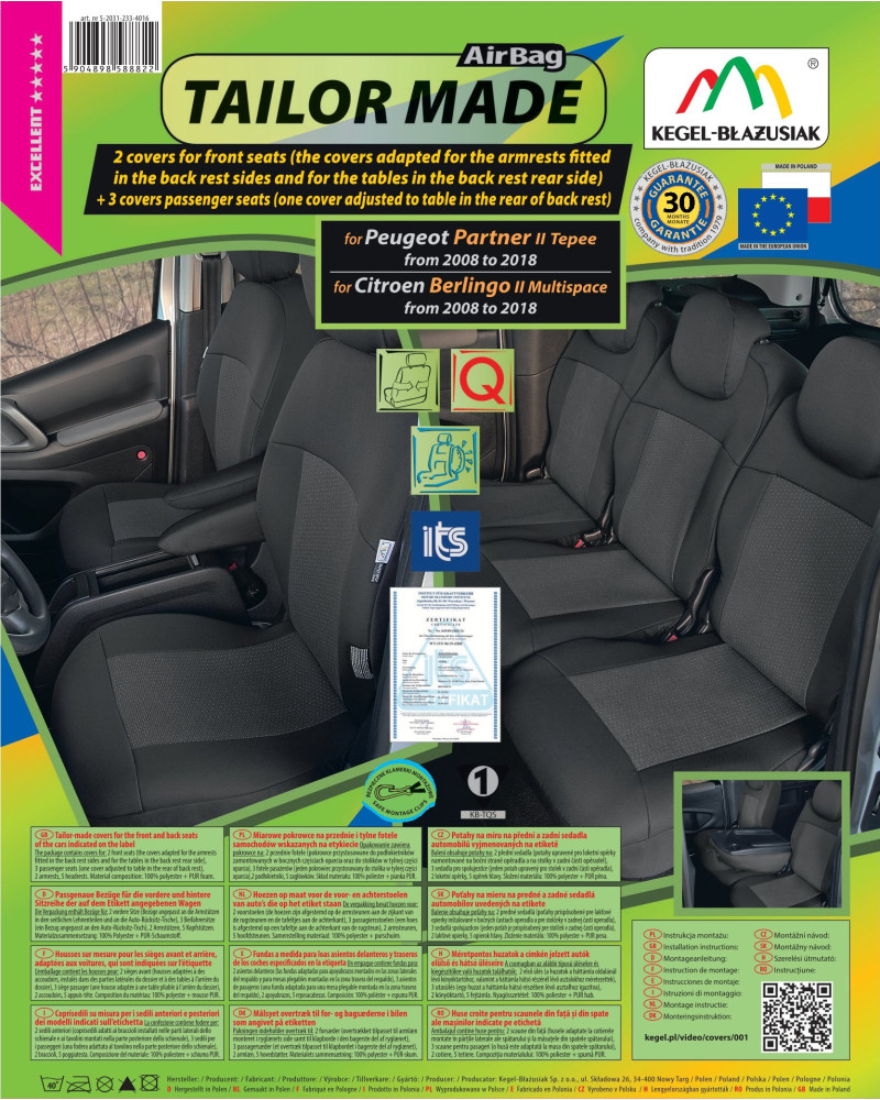 Ako už bolo uvedené predtým, predná i zadná časť poťahu sú ušité zo silného, pevného čalúnnického materiálu. Poťahy majú nevyhnutné, uzatvárateľné otvory, ktoré umožňujú ich natiahnutie bez nutnosti vyťahovať opierky hlavy a zhotovovať ďalšie otvory. Prednosťou poťahov TAILORE MADE je to, že kryjú celý zadný povrch operadla. Vďaka tejto vlastnosti vyzerajú veľmi dobre tiež zozadu sedačky a zároveň ju chránia pred znečistením a poškodením (to je dôležité predovšetkým pre osoby, ktoré majú malé deti). Komplet je vybavený špeciálnymi plastovými sponami, do materiálu sú všité pripevnenia, čo s pomocou priloženého obrázkového návodu na obsluhu zaisťuje veľmi ľahkú inštaláciu. Poťahy možno bez obáv prať na 40° – podľa pokynov na štítku. Výrobok renomovanej firmy Kegel-Błażusiak, najväčšieho výrobcu a exportéra v odvetví autopoťahov a pracovných odevov. Vyrobené v Poľsku, predovšetkým z poľských surovín, dodržaním všetkých kvalitatívnych štandardov Európskej únie. Nákupom poťahov Kegel-Błażusiak podporujete poľskú ekonomiku a chránite poľské pracovné miesta a tiež máte istotu, že si kupujete výrobok najvyššej kvality.