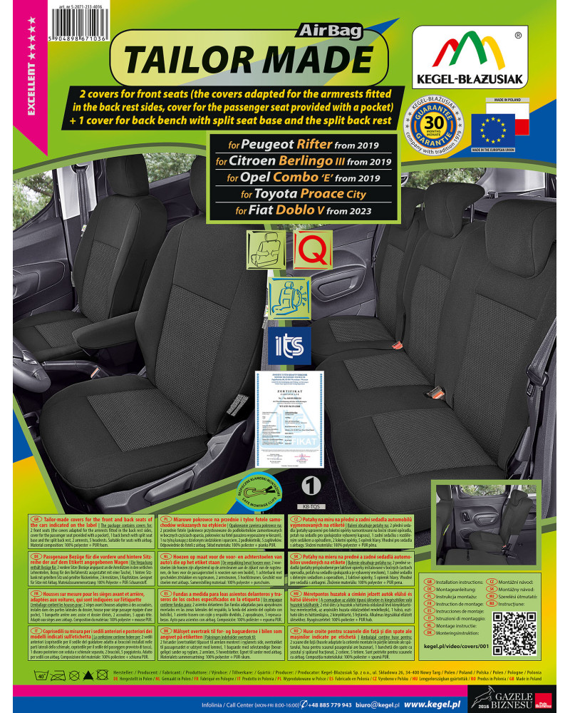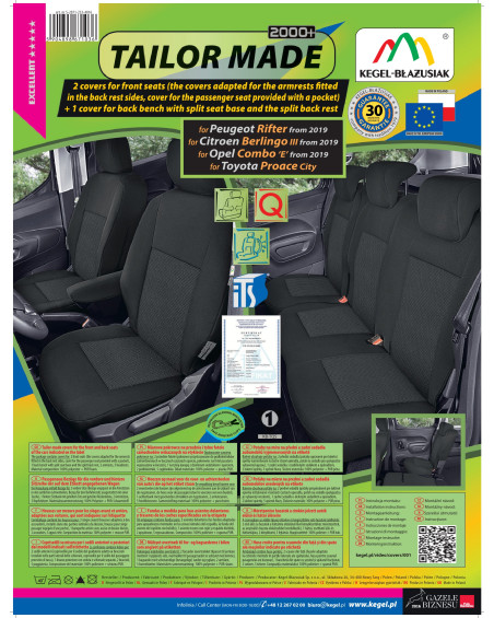 Ako už bolo uvedené predtým, predná i zadná časť poťahu sú ušité zo silného, pevného čalúnnického materiálu. Poťahy majú nevyhnutné, uzatvárateľné otvory, ktoré umožňujú ich natiahnutie bez nutnosti vyťahovať opierky hlavy a zhotovovať ďalšie otvory. Prednosťou poťahov TAILORE MADE je to, že kryjú celý zadný povrch operadla. Vďaka tejto vlastnosti vyzerajú veľmi dobre tiež zozadu sedačky a zároveň ju chránia pred znečistením a poškodením (to je dôležité predovšetkým pre osoby, ktoré majú malé deti). Komplet je vybavený špeciálnymi plastovými sponami, do materiálu sú všité pripevnenia, čo s pomocou priloženého obrázkového návodu na obsluhu zaisťuje veľmi ľahkú inštaláciu. Poťahy možno bez obáv prať na 40° – podľa pokynov na štítku. Výrobok renomovanej firmy Kegel-Błażusiak, najväčšieho výrobcu a exportéra v odvetví autopoťahov a pracovných odevov. Vyrobené v Poľsku, predovšetkým z poľských surovín, dodržaním všetkých kvalitatívnych štandardov Európskej únie. Nákupom poťahov Kegel-Błażusiak podporujete poľskú ekonomiku a chránite poľské pracovné miesta a tiež máte istotu, že si kupujete výrobok najvyššej kvality.