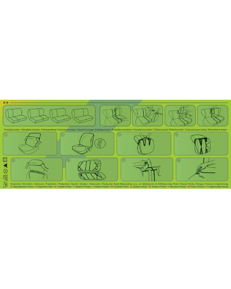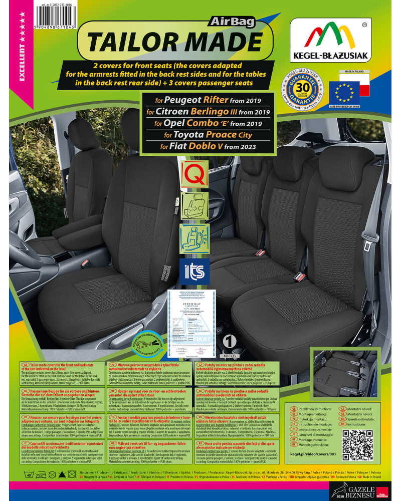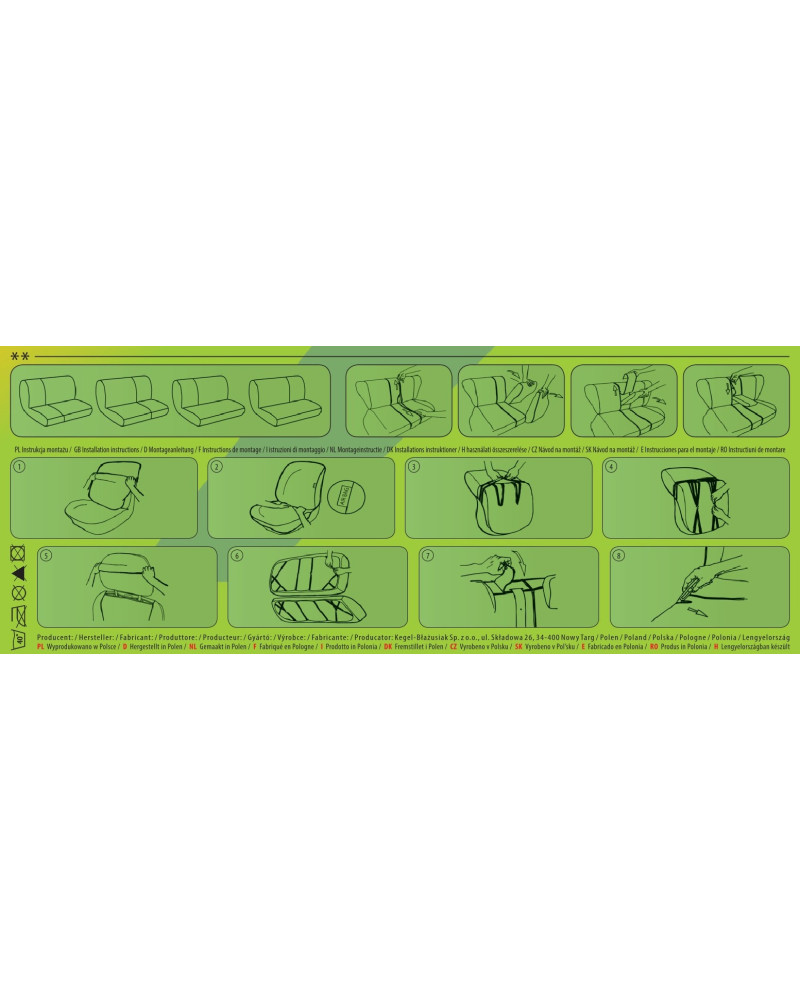 Ako už bolo uvedené predtým, predná i zadná časť poťahu sú ušité zo silného, pevného čalúnnického materiálu. Poťahy majú nevyhnutné, uzatvárateľné otvory, ktoré umožňujú ich natiahnutie bez nutnosti vyťahovať opierky hlavy a zhotovovať ďalšie otvory. Prednosťou poťahov TAILORE MADE je to, že kryjú celý zadný povrch operadla. Vďaka tejto vlastnosti vyzerajú veľmi dobre tiež zozadu sedačky a zároveň ju chránia pred znečistením a poškodením (to je dôležité predovšetkým pre osoby, ktoré majú malé deti). Komplet je vybavený špeciálnymi plastovými sponami, do materiálu sú všité pripevnenia, čo s pomocou priloženého obrázkového návodu na obsluhu zaisťuje veľmi ľahkú inštaláciu. Poťahy možno bez obáv prať na 40° – podľa pokynov na štítku. Výrobok renomovanej firmy Kegel-Błażusiak, najväčšieho výrobcu a exportéra v odvetví autopoťahov a pracovných odevov. Vyrobené v Poľsku, predovšetkým z poľských surovín, dodržaním všetkých kvalitatívnych štandardov Európskej únie. Nákupom poťahov Kegel-Błażusiak podporujete poľskú ekonomiku a chránite poľské pracovné miesta a tiež máte istotu, že si kupujete výrobok najvyššej kvality.