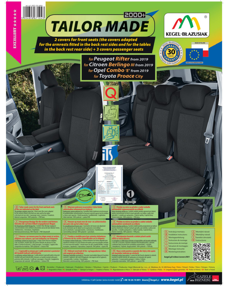 Ako už bolo uvedené predtým, predná i zadná časť poťahu sú ušité zo silného, pevného čalúnnického materiálu. Poťahy majú nevyhnutné, uzatvárateľné otvory, ktoré umožňujú ich natiahnutie bez nutnosti vyťahovať opierky hlavy a zhotovovať ďalšie otvory. Prednosťou poťahov TAILORE MADE je to, že kryjú celý zadný povrch operadla. Vďaka tejto vlastnosti vyzerajú veľmi dobre tiež zozadu sedačky a zároveň ju chránia pred znečistením a poškodením (to je dôležité predovšetkým pre osoby, ktoré majú malé deti). Komplet je vybavený špeciálnymi plastovými sponami, do materiálu sú všité pripevnenia, čo s pomocou priloženého obrázkového návodu na obsluhu zaisťuje veľmi ľahkú inštaláciu. Poťahy možno bez obáv prať na 40° – podľa pokynov na štítku. Výrobok renomovanej firmy Kegel-Błażusiak, najväčšieho výrobcu a exportéra v odvetví autopoťahov a pracovných odevov. Vyrobené v Poľsku, predovšetkým z poľských surovín, dodržaním všetkých kvalitatívnych štandardov Európskej únie. Nákupom poťahov Kegel-Błażusiak podporujete poľskú ekonomiku a chránite poľské pracovné miesta a tiež máte istotu, že si kupujete výrobok najvyššej kvality.
