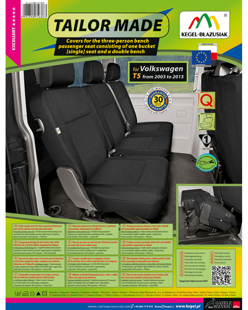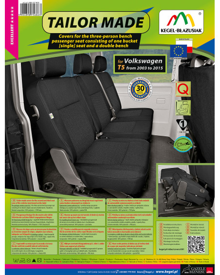 Ako už bolo uvedené predtým, predná i zadná časť poťahu sú ušité zo silného, pevného čalúnnického materiálu. Poťahy majú nevyhnutné, uzatvárateľné otvory, ktoré umožňujú ich natiahnutie bez nutnosti vyťahovať opierky hlavy a zhotovovať ďalšie otvory. Prednosťou poťahov TAILORE MADE je to, že kryjú celý zadný povrch operadla. Vďaka tejto vlastnosti vyzerajú veľmi dobre tiež zozadu sedačky a zároveň ju chránia pred znečistením a poškodením (to je dôležité predovšetkým pre osoby, ktoré majú malé deti). Komplet je vybavený špeciálnymi plastovými sponami, do materiálu sú všité pripevnenia, čo s pomocou priloženého obrázkového návodu na obsluhu zaisťuje veľmi ľahkú inštaláciu. Poťahy možno bez obáv prať na 40° – podľa pokynov na štítku. Výrobok renomovanej firmy Kegel-Błażusiak, najväčšieho výrobcu a exportéra v odvetví autopoťahov a pracovných odevov. Vyrobené v Poľsku, predovšetkým z poľských surovín, dodržaním všetkých kvalitatívnych štandardov Európskej únie. Nákupom poťahov Kegel-Błażusiak podporujete poľskú ekonomiku a chránite poľské pracovné miesta a tiež máte istotu, že si kupujete výrobok najvyššej kvality.