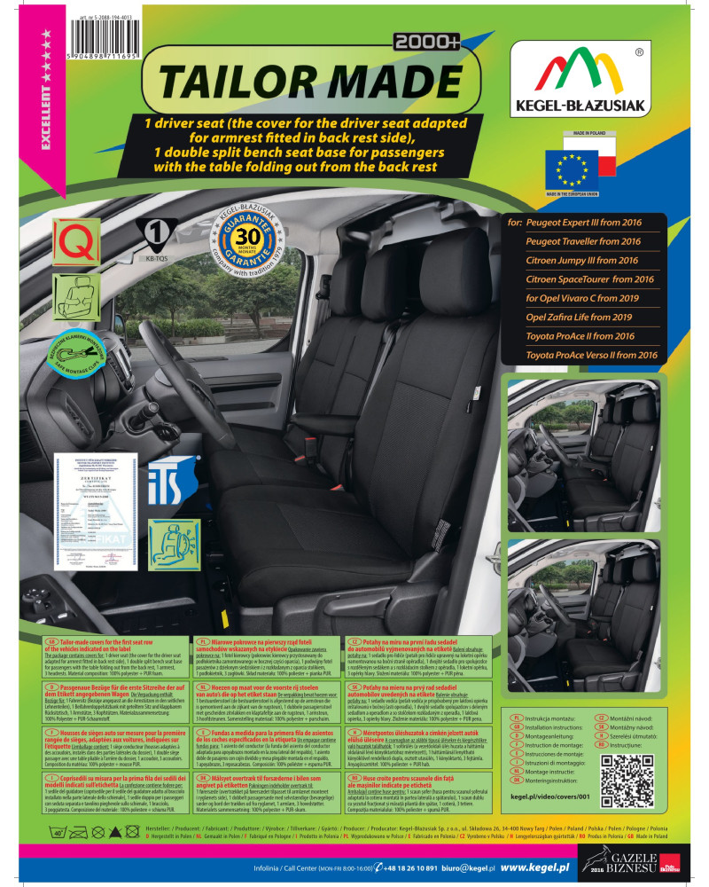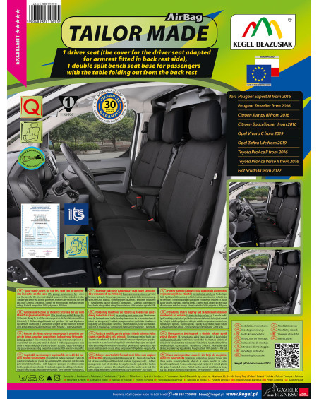 Ako už bolo uvedené predtým, predná i zadná časť poťahu sú ušité zo silného, pevného čalúnnického materiálu. Poťahy majú nevyhnutné, uzatvárateľné otvory, ktoré umožňujú ich natiahnutie bez nutnosti vyťahovať opierky hlavy a zhotovovať ďalšie otvory. Prednosťou poťahov TAILORE MADE je to, že kryjú celý zadný povrch operadla. Vďaka tejto vlastnosti vyzerajú veľmi dobre tiež zozadu sedačky a zároveň ju chránia pred znečistením a poškodením (to je dôležité predovšetkým pre osoby, ktoré majú malé deti). Komplet je vybavený špeciálnymi plastovými sponami, do materiálu sú všité pripevnenia, čo s pomocou priloženého obrázkového návodu na obsluhu zaisťuje veľmi ľahkú inštaláciu. Poťahy možno bez obáv prať na 40° – podľa pokynov na štítku. Výrobok renomovanej firmy Kegel-Błażusiak, najväčšieho výrobcu a exportéra v odvetví autopoťahov a pracovných odevov. Vyrobené v Poľsku, predovšetkým z poľských surovín, dodržaním všetkých kvalitatívnych štandardov Európskej únie. Nákupom poťahov Kegel-Błażusiak podporujete poľskú ekonomiku a chránite poľské pracovné miesta a tiež máte istotu, že si kupujete výrobok najvyššej kvality.