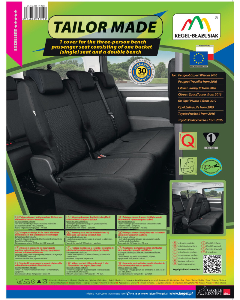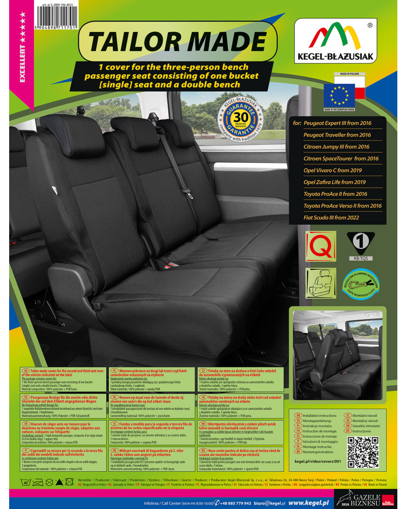 Ako už bolo uvedené predtým, predná i zadná časť poťahu sú ušité zo silného, pevného čalúnnického materiálu. Poťahy majú nevyhnutné, uzatvárateľné otvory, ktoré umožňujú ich natiahnutie bez nutnosti vyťahovať opierky hlavy a zhotovovať ďalšie otvory. Prednosťou poťahov TAILORE MADE je to, že kryjú celý zadný povrch operadla. Vďaka tejto vlastnosti vyzerajú veľmi dobre tiež zozadu sedačky a zároveň ju chránia pred znečistením a poškodením (to je dôležité predovšetkým pre osoby, ktoré majú malé deti). Komplet je vybavený špeciálnymi plastovými sponami, do materiálu sú všité pripevnenia, čo s pomocou priloženého obrázkového návodu na obsluhu zaisťuje veľmi ľahkú inštaláciu. Poťahy možno bez obáv prať na 40° – podľa pokynov na štítku. Výrobok renomovanej firmy Kegel-Błażusiak, najväčšieho výrobcu a exportéra v odvetví autopoťahov a pracovných odevov. Vyrobené v Poľsku, predovšetkým z poľských surovín, dodržaním všetkých kvalitatívnych štandardov Európskej únie. Nákupom poťahov Kegel-Błażusiak podporujete poľskú ekonomiku a chránite poľské pracovné miesta a tiež máte istotu, že si kupujete výrobok najvyššej kvality.