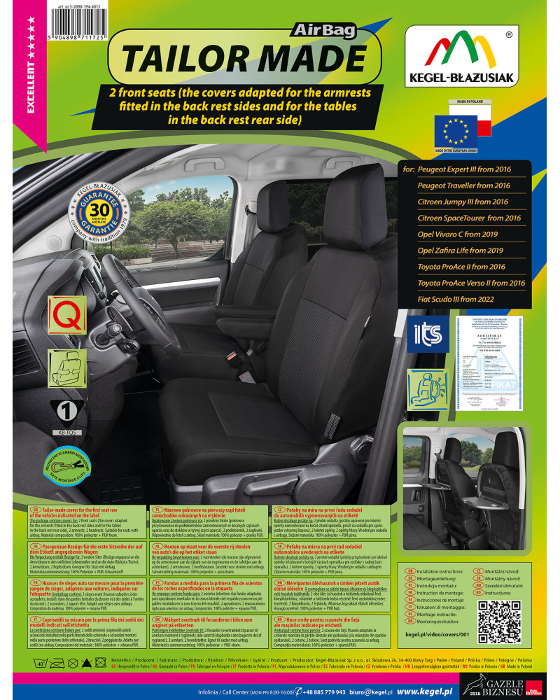 Ako už bolo uvedené predtým, predná i zadná časť poťahu sú ušité zo silného, pevného čalúnnického materiálu. Poťahy majú nevyhnutné, uzatvárateľné otvory, ktoré umožňujú ich natiahnutie bez nutnosti vyťahovať opierky hlavy a zhotovovať ďalšie otvory. Prednosťou poťahov TAILORE MADE je to, že kryjú celý zadný povrch operadla. Vďaka tejto vlastnosti vyzerajú veľmi dobre tiež zozadu sedačky a zároveň ju chránia pred znečistením a poškodením (to je dôležité predovšetkým pre osoby, ktoré majú malé deti). Komplet je vybavený špeciálnymi plastovými sponami, do materiálu sú všité pripevnenia, čo s pomocou priloženého obrázkového návodu na obsluhu zaisťuje veľmi ľahkú inštaláciu. Poťahy možno bez obáv prať na 40° – podľa pokynov na štítku. Výrobok renomovanej firmy Kegel-Błażusiak, najväčšieho výrobcu a exportéra v odvetví autopoťahov a pracovných odevov. Vyrobené v Poľsku, predovšetkým z poľských surovín, dodržaním všetkých kvalitatívnych štandardov Európskej únie. Nákupom poťahov Kegel-Błażusiak podporujete poľskú ekonomiku a chránite poľské pracovné miesta a tiež máte istotu, že si kupujete výrobok najvyššej kvality.