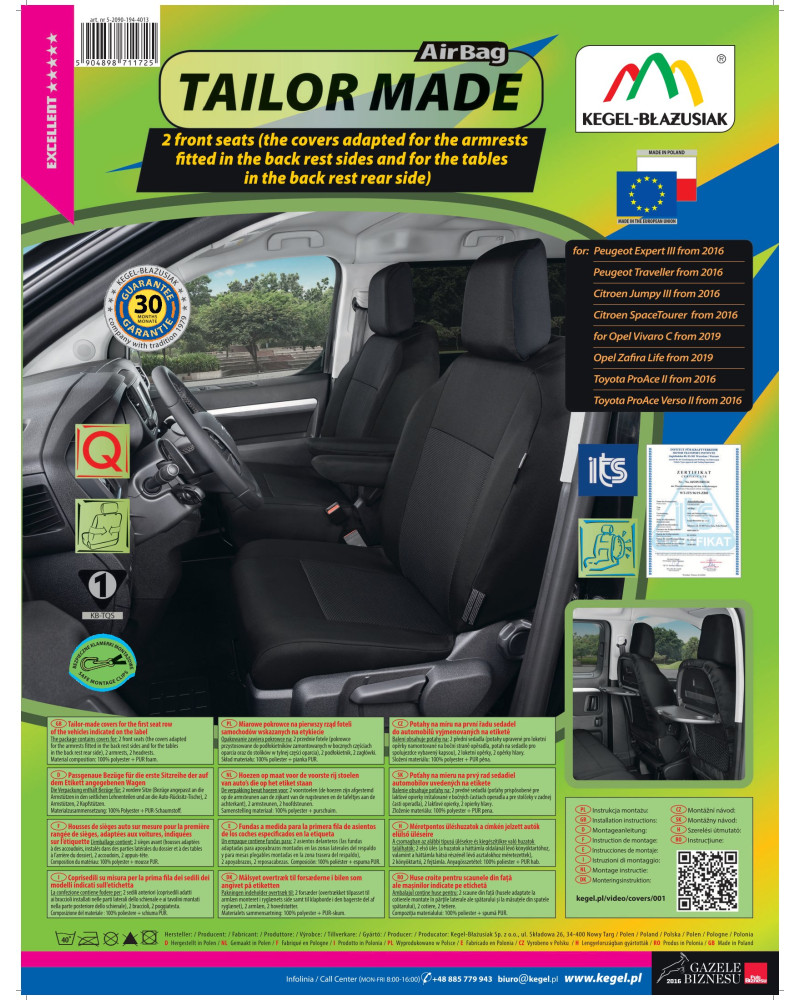 Ako už bolo uvedené predtým, predná i zadná časť poťahu sú ušité zo silného, pevného čalúnnického materiálu. Poťahy majú nevyhnutné, uzatvárateľné otvory, ktoré umožňujú ich natiahnutie bez nutnosti vyťahovať opierky hlavy a zhotovovať ďalšie otvory. Prednosťou poťahov TAILORE MADE je to, že kryjú celý zadný povrch operadla. Vďaka tejto vlastnosti vyzerajú veľmi dobre tiež zozadu sedačky a zároveň ju chránia pred znečistením a poškodením (to je dôležité predovšetkým pre osoby, ktoré majú malé deti). Komplet je vybavený špeciálnymi plastovými sponami, do materiálu sú všité pripevnenia, čo s pomocou priloženého obrázkového návodu na obsluhu zaisťuje veľmi ľahkú inštaláciu. Poťahy možno bez obáv prať na 40° – podľa pokynov na štítku. Výrobok renomovanej firmy Kegel-Błażusiak, najväčšieho výrobcu a exportéra v odvetví autopoťahov a pracovných odevov. Vyrobené v Poľsku, predovšetkým z poľských surovín, dodržaním všetkých kvalitatívnych štandardov Európskej únie. Nákupom poťahov Kegel-Błażusiak podporujete poľskú ekonomiku a chránite poľské pracovné miesta a tiež máte istotu, že si kupujete výrobok najvyššej kvality.