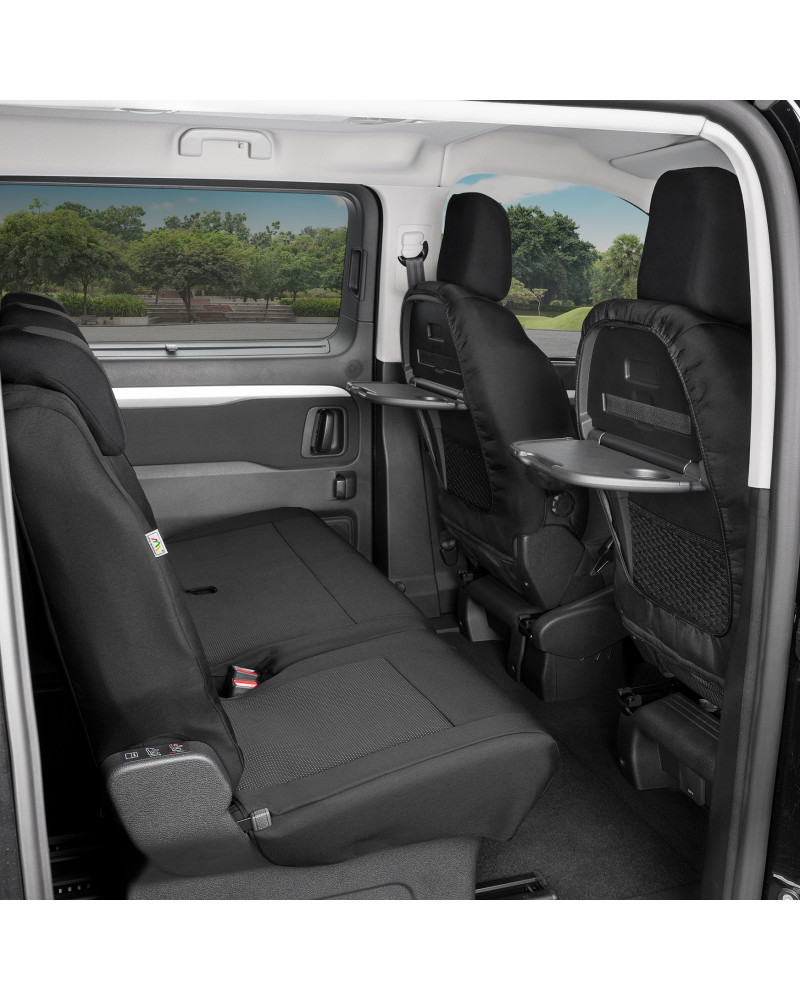 -2 predné sedadlá (poťahy prispôsobené pre lakťové opierky inštalované v bočných častiach operadla a pre stolčeky v zadnej časti operadla)