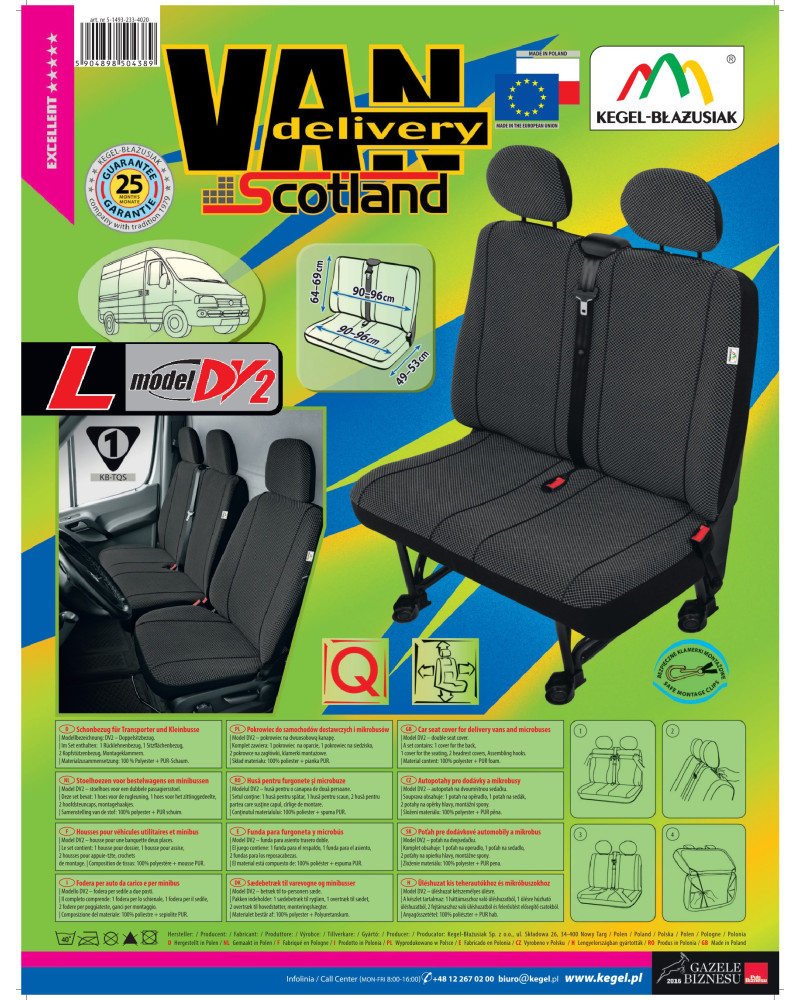 Prispôsobené poťahy SCOTLAND sú nesmierne pekné a praktické kryty sedadiel do dodávok, ktoré zaisťujú užívateľom pohodlie a bezpečnosť. Sú zhotovené z najkvalitnejších materiálov, vďaka čomu vyvolávajú jedinečné estetické dojmy a zároveň chránia čalúnenie vášho auta pred poškodením a znečistením. Poťah sa vyznačuje dlhou životnosťou, odolnosťou voči oteru, ľahkosťou údržby a vďaka laminovaniu na vnútornej strane PUR penou vysokou priľnavosťou. Silná látka spolu s penou dobre priliehajú k sedadlu. Inovatívna konštrukcia zaisťuje dobré prispôsobenie poťahov konkrétnym modelom áut. Materiál, z ktorého sú poťahy vyrobené, spĺňa najvyššie odolnostné normy. Poťahy si udržujú tmavú, zladenú farebnosť, skvele vyzerajú v interiéri každého vozidla. Vkusná, biela vzorka na čiernom materiáli pôsobí šik a elegantne. Poskytovaná záruka až 25 mesiacov vám dá istotu, že si kupujete výrobok najvyššej kvality.