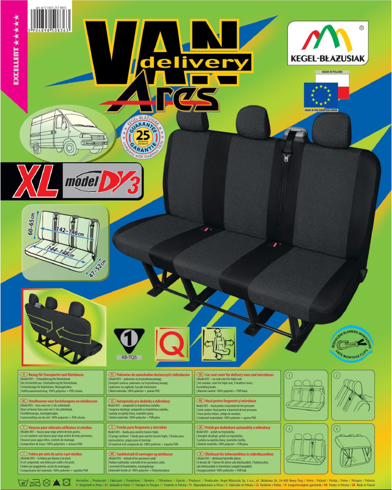 Poťahy na mieru ARES - pohodlné a bezpečné autopoťahy navrhnuté s ohľadom na majiteľov dodávok a mikrobusov - profesionálne vyrobené z neľahko horľavého, vysoko kvalitného žakárového materiálu. Presne z takýchto materiálov sa vyrábajú originálne obšitia sedačiek nových vozidiel pre automobilové továrne. Starostlivo ušité a dôkladne olemované. Vďaka správnej konštrukcii a rozmerom sa poťahy skvelo prispôsobia tvaru sedadiel konkrétnych modelov automobilov. Vďaka laminácii na vnútornej strane PUR penou sa neposúvajú voči sedadlu. Poťahy ARES efektívne chránia čalúnenie pred predratím, znečistením a zničením a tiež skvele vyzerajú vo vnútri vozidla. Poťahy sú celé vyrobené zo silného, odolného, pevného žakárového materiálu. Materiál má čiernu farbu - čierna s jemnou šedou textúrou skvele zapadne do interiéru každého automobilu. Poskytovaná záruka až 25 mesiacov vám dá istotu, že si kupujete výrobok najvyššej kvality.