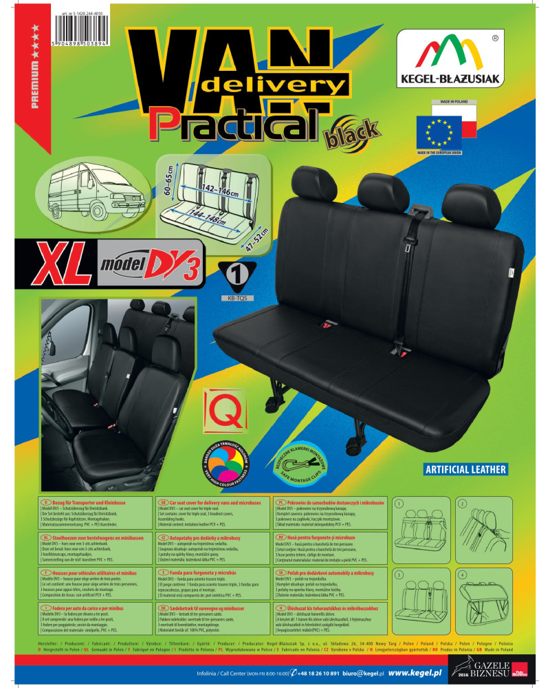 Prispôsobené poťahy PRACTICAL vznikli z nesmierne stálej ekokože novej generácie, čo v kombinácii so starostlivosťou zakončenia aj tých najmenších detailov uspokojí aj tých najnáročnejších zákazníkov. Správne nasadené poťahy nie sú prakticky na rozoznanie od originálneho koženého čalúnenia sedadiel a tohto efektu možno dosiahnuť za skutočne nízku cenu. Poťah je vyrobený zo silného a stáleho materiálu a vďaka správnej konštrukcii sa dobre prispôsobí sedadlám a priľne k nim, čím zabraňuje posúvaniu sa poťahu. Autopoťahy PRACTICAL veľmi dobre chránia originálne čalúnenie auta pred predratím a zničením a vkusný, moderný štýl vyvoláva pozitívne estetické vnemy. Produkt sa veľmi ľahko inštaluje a čistí. Poctivé prevedenie zaručuje vysokú kvalitu a dlhú dobu používania. Nepremokavý, nešpiniaci sa a nesmierne odolný materiál zaisťuje praktické používanie. Ponuka cieli na majiteľov dodávok a mikrobusov, ktorí sa chcú postarať o interiér svojich vozidiel, učiniť ich šik a dodať im eleganciu. Čierna, univerzálna farebnosť sa ideálne zladí s interiérom každého vozidla. Poťahy vyzerajú skvelo v každom aute. Sú výnimočne elegantné, preto tiež vďaka nim každý interiér pozdvihne svoju úroveň a získa gráciu.
