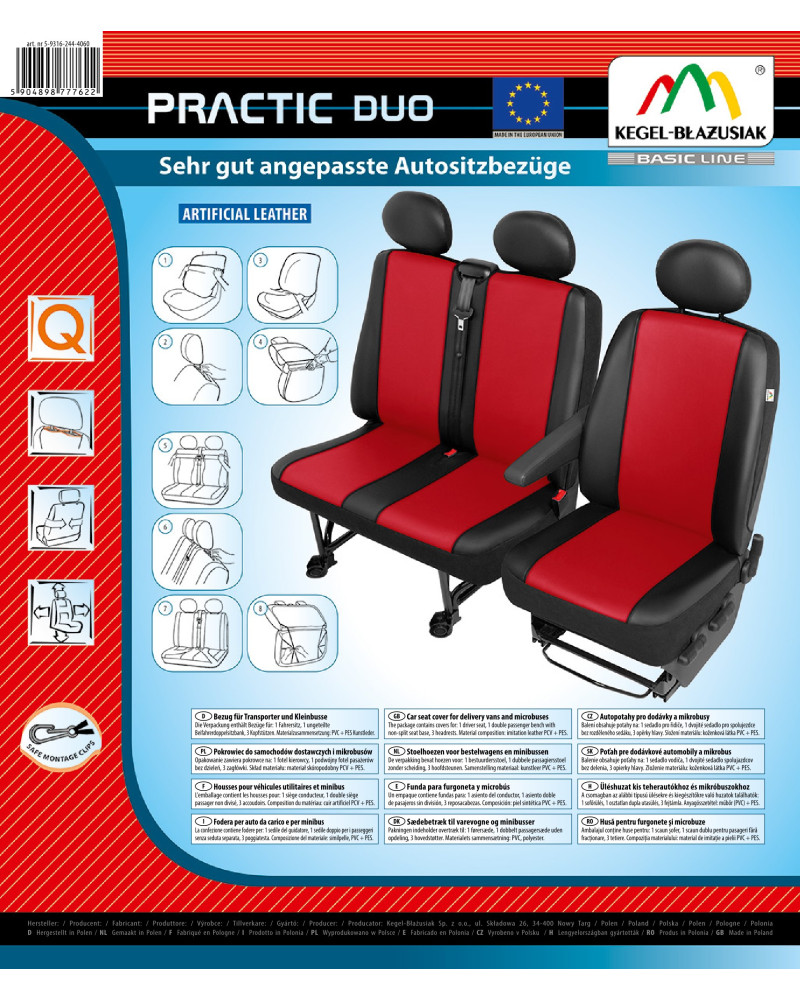 Prispôsobené poťahy PRACTIC DUO vznikli z nesmierne stálej ekokože novej generácie, čo v kombinácii so starostlivosťou zakončenia aj tých najmenších detailov uspokojí aj tých najnáročnejších zákazníkov. Správne nasadené poťahy nie sú prakticky na rozoznanie od originálneho koženého čalúnenia sedadiel a tohto efektu možno dosiahnuť za skutočne nízku cenu. Poťah je vyrobený zo silného a stáleho materiálu a vďaka správnej konštrukcii sa dobre prispôsobí sedadlám a priľne k nim, čím zabraňuje posúvaniu sa poťahu. Autopoťahy PRACTIC DUO veľmi dobre chránia originálne čalúnenie auta pred predratím a zničením a vkusný, moderný štýl vyvoláva pozitívne estetické vnemy. Produkt sa veľmi ľahko inštaluje a čistí. Poctivé prevedenie zaručuje vysokú kvalitu a dlhú dobu používania. Nepremokavý, nešpiniaci sa a nesmierne odolný materiál zaisťuje praktické používanie. Ponuka cieli na majiteľov dodávok a mikrobusov, ktorí sa chcú postarať o interiér svojich vozidiel, učiniť ich šik a dodať im eleganciu. Poťahy vyzerajú skvelo v každom aute. Sú výnimočne elegantné, preto tiež vďaka nim každý interiér pozdvihne svoju úroveň a získa gráciu.