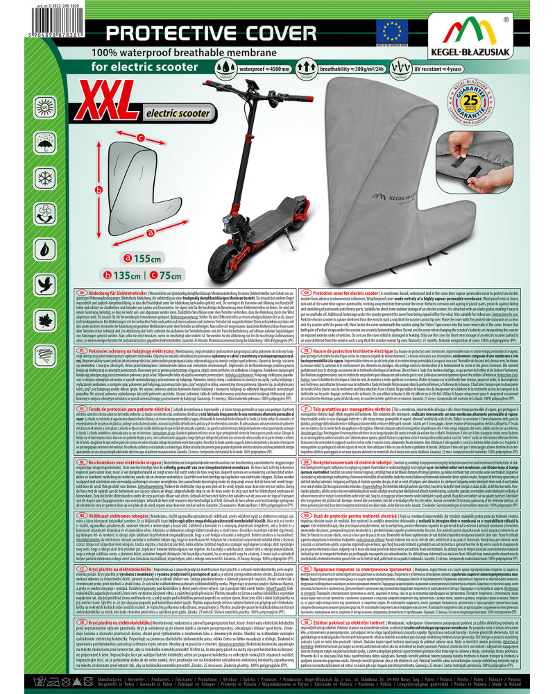 Membránový, vodotesný a zároveň paropriepustný kryt, ktorý chráni vašu elektrickú kolobežku pred nepriaznivými vplyvmi prostredia. Kryt je vodotesný aj pri silnom daždi a zároveň paropriepustný, odvádzajúci vlhkosť spod krytu. Zmierňuje koróziu a starnutie plastových dielov, chráni pred vyblednutím a zmatnením laku a chrómových dielov. Vhodný na krátkodobé vonkajšie uskladnenie elektrickej kolobežky. Pripevňuje sa pomocou elastického sťahovacieho pásu, vďaka čomu sa ľahko nasadzuje a sťahuje. Dodatočné upevnenia pod kolobežkou zabraňujú strhnutiu krytu vetrom. Vhodný aj na použitie v interiéri.