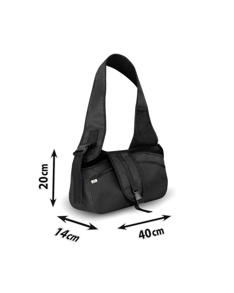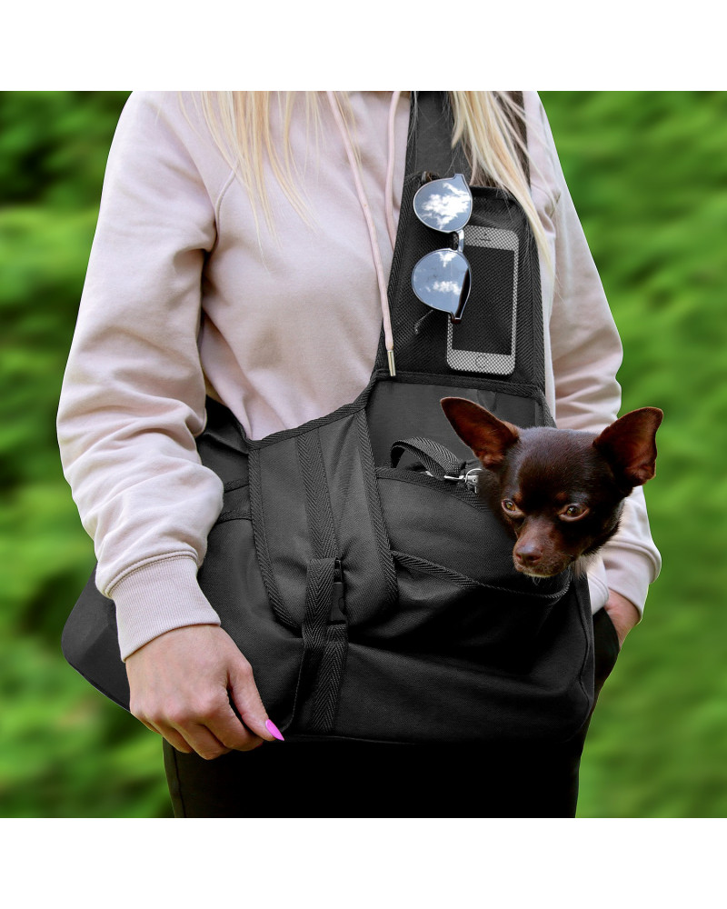 Pohodlná a praktická taška pre komfortné prenášanie malých psov. Zaisťuje pohodlie prenášanému psovi aj jeho pánovi. Zaisťuje psovi bezpečný priestor so spoľahlivou základňou vo vnútri tašky a majiteľovi vďaka ergonomickej konštrukcii so širokým a nastaviteľným popruhom umožňuje prenášanie psa (psov) bez tlačenia dokonca aj počas dlhých prechádzok. Vďaka starostlivo prepracovanej konštrukcii sa prenášané psy v taške cítia bezpečne a pohodlne, a blízkosť pána navyše zvyšuje pocit bezpečia. Taška má vystužené dno zaisťujúce psovi pevnú základňu a vrecká, do ktorých možno uložiť drobné predmety, ako je smartfón, vôdzka, maškrty a pod. Taška zaisťuje pánovi nielen ľahké a pohodlné prenášanie maznáčika, ale aj slobodné pohyby rúk, ktoré má pán obe voľné.
