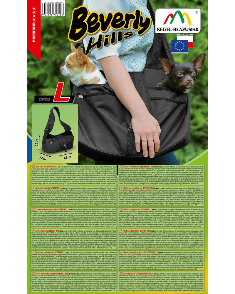 Veľkosť L pre psa veľkosti maltézsky psík alebo dva psy veľkosti čivava. Nosnosť tašky do 10 kg S dvomi mini vôdzkami vo vnútri tašky a zapínateľným poklopom s nastavením na ochranu psov pred vyskočením.