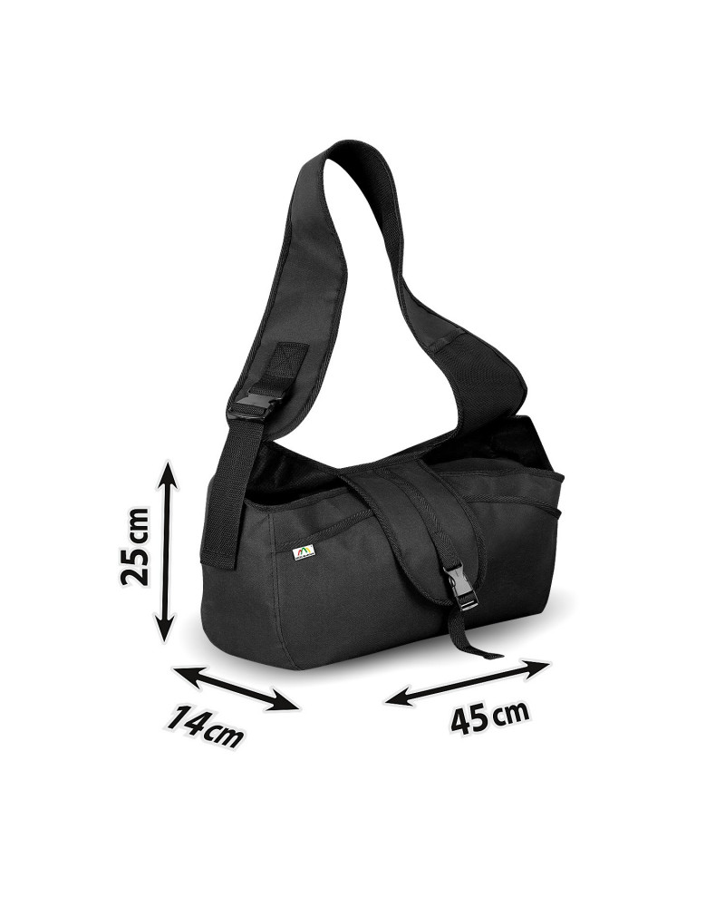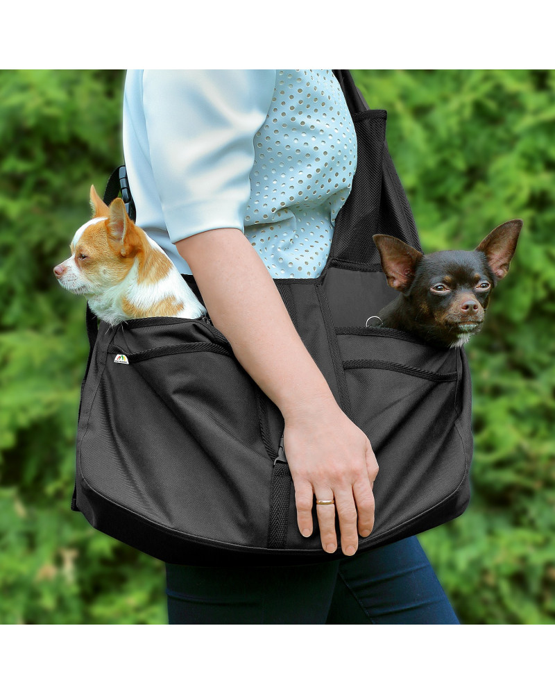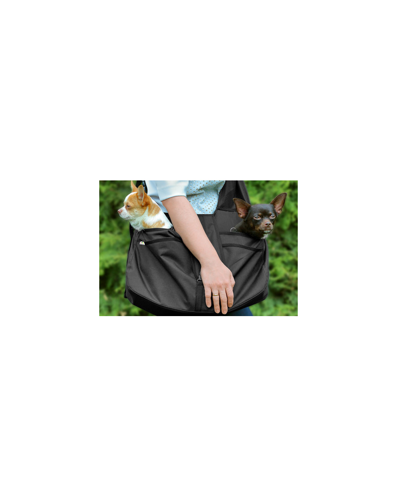 Pohodlná a praktická taška pre komfortné prenášanie malých psov. Zaisťuje pohodlie prenášanému psovi aj jeho pánovi. Zaisťuje psovi bezpečný priestor so spoľahlivou základňou vo vnútri tašky a majiteľovi vďaka ergonomickej konštrukcii so širokým a nastaviteľným popruhom umožňuje prenášanie psa (psov) bez tlačenia dokonca aj počas dlhých prechádzok. Vďaka starostlivo prepracovanej konštrukcii sa prenášané psy v taške cítia bezpečne a pohodlne, a blízkosť pána navyše zvyšuje pocit bezpečia. Taška má vystužené dno zaisťujúce psovi pevnú základňu a vrecká, do ktorých možno uložiť drobné predmety, ako je smartfón, vôdzka, maškrty a pod. Taška zaisťuje pánovi nielen ľahké a pohodlné prenášanie maznáčika, ale aj slobodné pohyby rúk, ktoré má pán obe voľné.