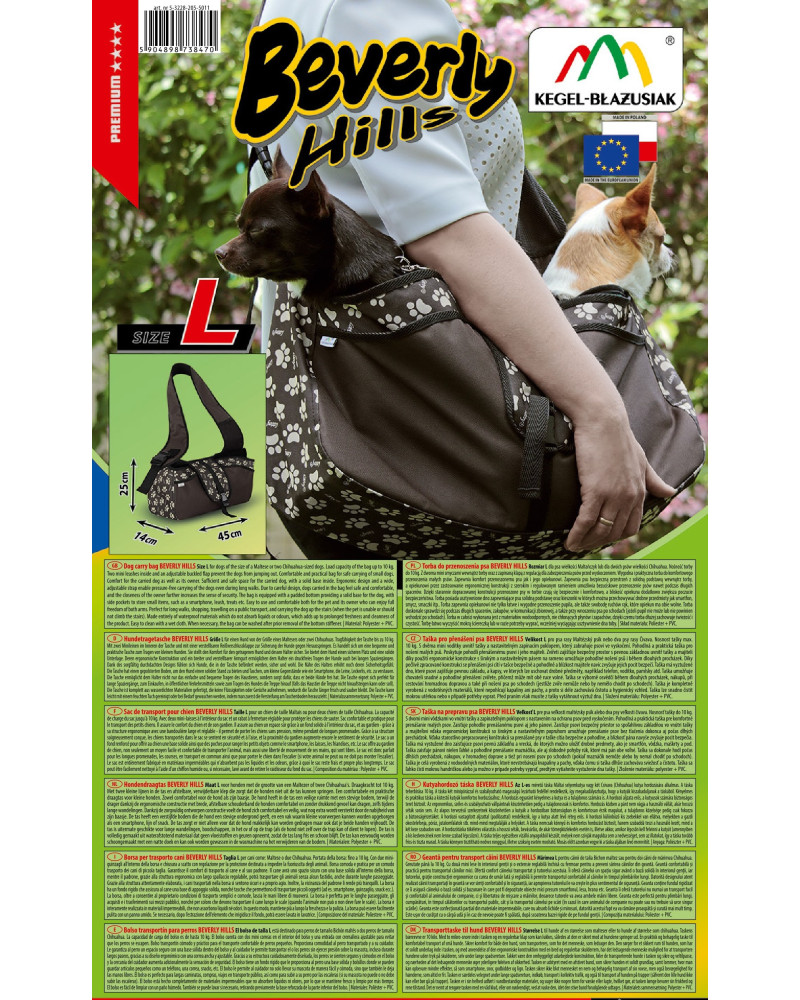Veľkosť L pre psa veľkosti maltézsky psík alebo dva psy veľkosti čivava. Nosnosť tašky do 10 kg S dvomi mini vôdzkami vo vnútri tašky a zapínateľným poklopom s nastavením na ochranu psov pred vyskočením.