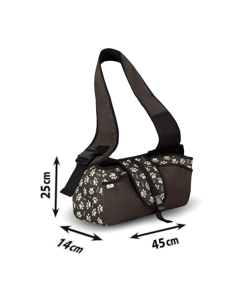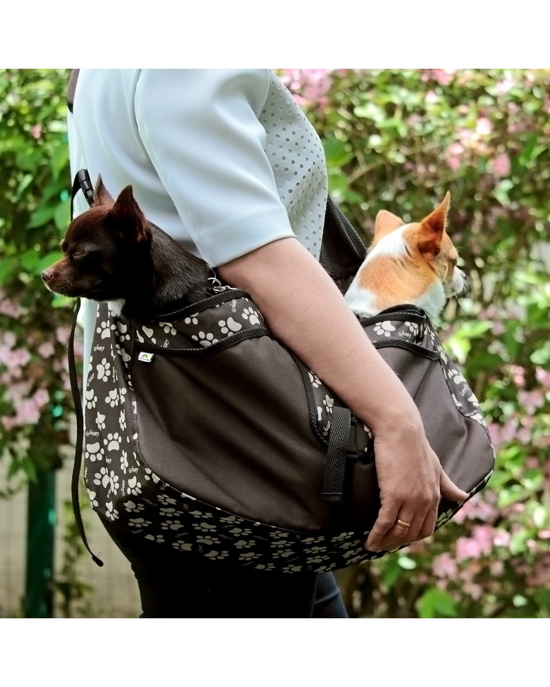 Pohodlná a praktická taška pre komfortné prenášanie malých psov. Zaisťuje pohodlie prenášanému psovi aj jeho pánovi. Zaisťuje psovi bezpečný priestor so spoľahlivou základňou vo vnútri tašky a majiteľovi vďaka ergonomickej konštrukcii so širokým a nastaviteľným popruhom umožňuje prenášanie psa (psov) bez tlačenia dokonca aj počas dlhých prechádzok. Vďaka starostlivo prepracovanej konštrukcii sa prenášané psy v taške cítia bezpečne a pohodlne, a blízkosť pána navyše zvyšuje pocit bezpečia. Taška má vystužené dno zaisťujúce psovi pevnú základňu a vrecká, do ktorých možno uložiť drobné predmety, ako je smartfón, vôdzka, maškrty a pod. Taška zaisťuje pánovi nielen ľahké a pohodlné prenášanie maznáčika, ale aj slobodné pohyby rúk, ktoré má pán obe voľné.