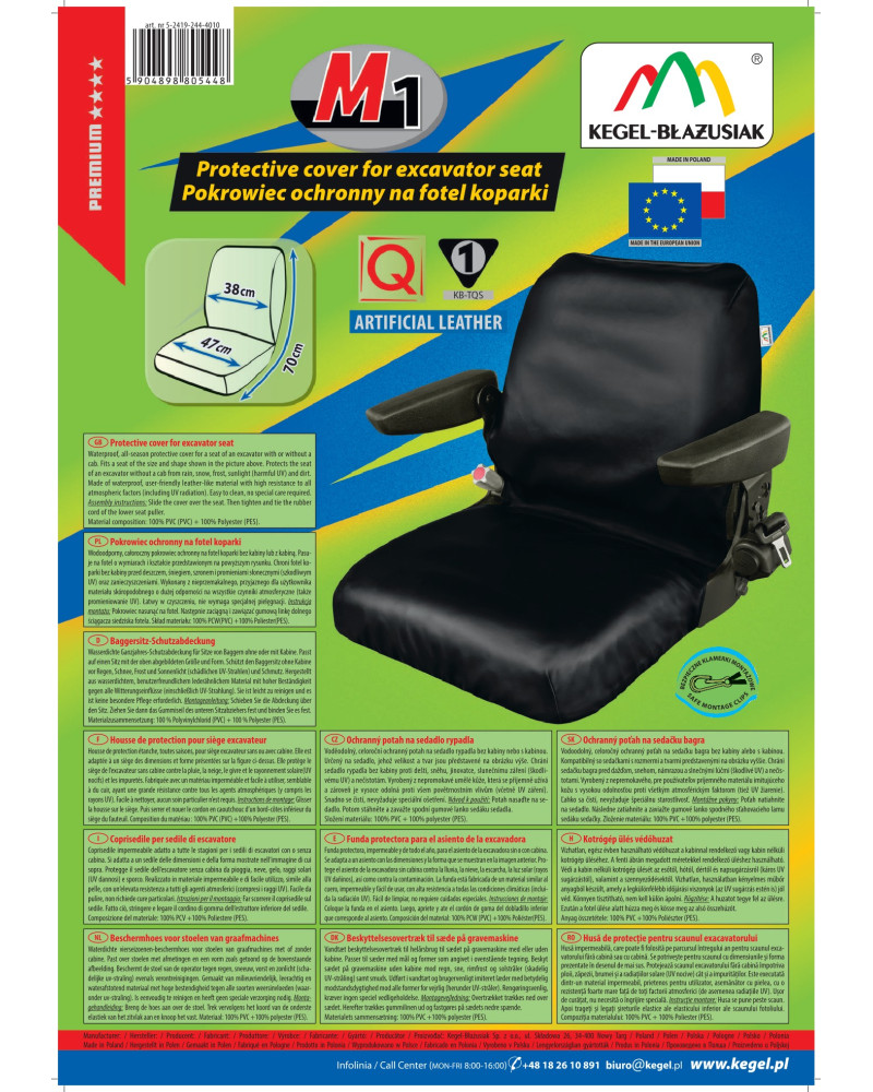 Vodoodolný, celoročný ochranný poťah na sedačku bagra bez kabíny alebo s kabínou. Kompatibilný so sedačkami s rozmermi a tvarmi predstavenými na obrázku vyššie. Chráni sedačku bagra pred dažďom, snehom, námrazou a slnečnými lúčmi (škodlivé UV) a nečistotami. Vyrobený z nepremokavého, pre používateľov príjemného materiálu imitujúceho kožu s vysokou odolnosťou proti všetkým atmosférickým faktorom (tiež UV žiarenie). Ľahko sa čistí, nevyžaduje špeciálnu starostlivosť.