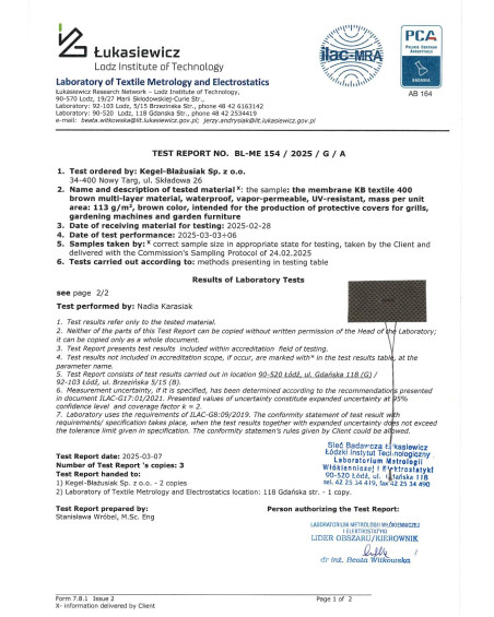 O dlhej životnosti krycích plachiet rozhoduje ich odolnosť proti slnečnému žiareniu (UV), vysokým teplotám, dažďu, mrazu, snehu a nečistotám prírodného pôvodu. Naši špecialisti vyvinuli efektívne metódy testovania odolnosti materiálov proti vonkajším podmienkam na základe vlastných dlhoročných testov v prirodzenom prostredí a skúšobnej normy PN-EN ISO 4892-3. V komore na umelé starnutie Atlas UVtest z USA je dôkladne testovaná každá dodávka materiálov, z ktorých sa vyrábajú krycie plachty Kegel-Błażusiak. Vďaka kontrole kvality materiálov a dlhodobých testov v životnom prostredí zaručujeme svojim zákazníkom niekoľkoročnú životnosť našich krycích plachiet dokonca i pri intenzívnom používaní.