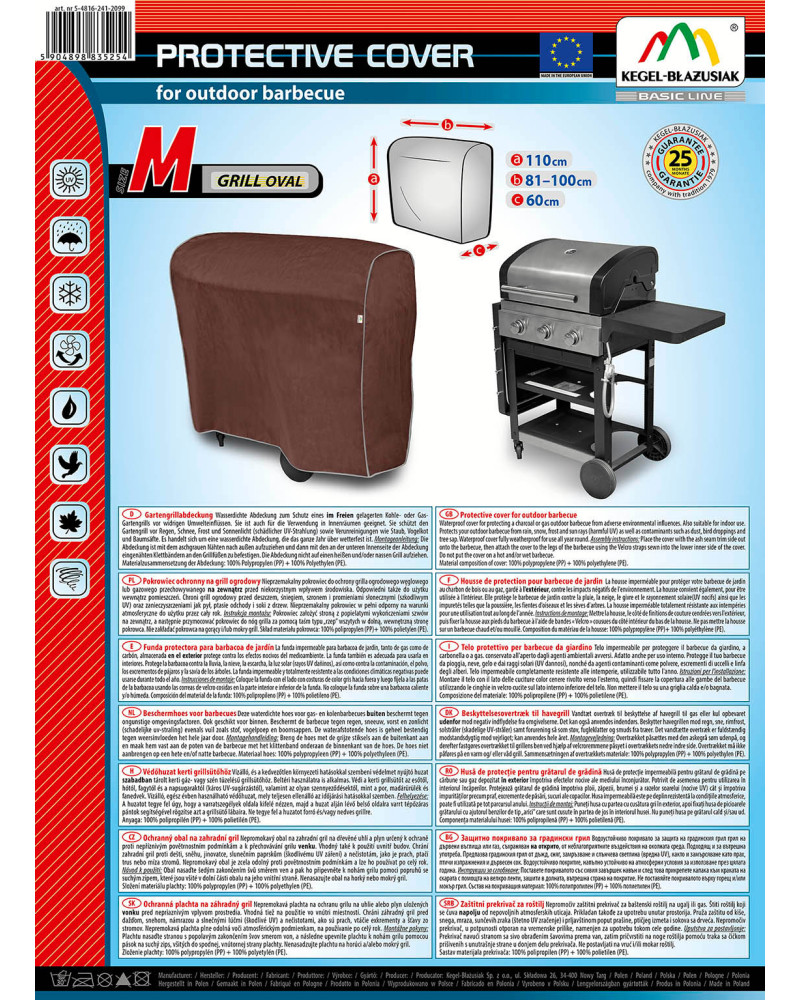 Nepremokavá plachta na ochranu grilu na uhlie alebo plyn uložených vonku pred nepriaznivým vplyvom prostredia. Vhodná tiež na použitie vo vnútri miestností. Chráni záhradný gril pred dažďom, snehom, námrazou a slnečnými lúčmi (škodlivé UV) a nečistotami, ako sú prach, vtáčie exkrementy a šťavy zo stromov. Nepremokavá plachta plne odolná voči atmosférickým podmienkam, na používanie po celý rok.