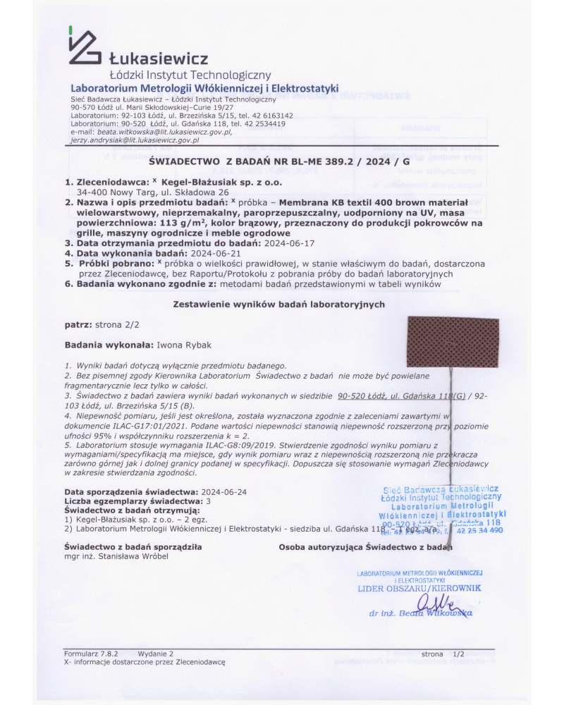 O dlhej životnosti krycích plachiet rozhoduje ich odolnosť proti slnečnému žiareniu (UV), vysokým teplotám, dažďu, mrazu, snehu a nečistotám prírodného pôvodu. Naši špecialisti vyvinuli efektívne metódy testovania odolnosti materiálov proti vonkajším podmienkam na základe vlastných dlhoročných testov v prirodzenom prostredí a skúšobnej normy PN-EN ISO 4892-3. V komore na umelé starnutie Atlas UVtest z USA je dôkladne testovaná každá dodávka materiálov, z ktorých sa vyrábajú krycie plachty Kegel-Błażusiak. Vďaka kontrole kvality materiálov a dlhodobých testov v životnom prostredí zaručujeme svojim zákazníkom niekoľkoročnú životnosť našich krycích plachiet dokonca i pri intenzívnom používaní.
