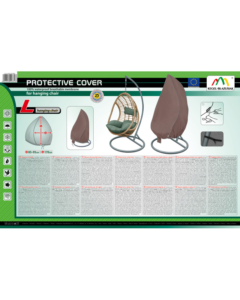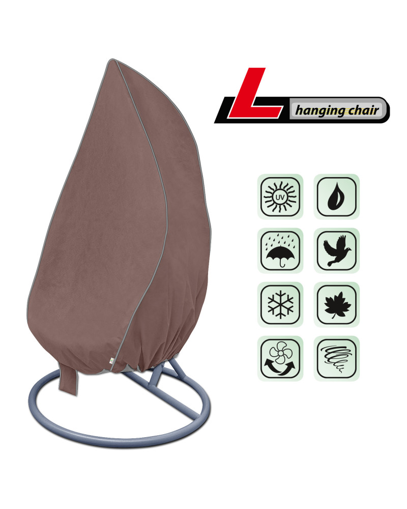Membránový, nepremokavý a zároveň paropriepustný obal na ochranu závesného kresla skladovaného vonku pred nepriaznivými vplyvmi počasia. Odolný voči vplyvom počasia, vyrobený výlučne z vysoko paropriepustnej membrány. Nepremokavý aj pri intenzívnom daždi a zároveň paropriepustný, odvádza vlhkosť z obalu von. Chráni závesné kreslo spolu s rámom pred dažďom, snehom, námrazou a slnečným žiarením (škodlivým UV žiarením) a znečistením, ako je prach, vtáčie výtrusy a šťavy zo stromov. Obmedzuje koróziu a starnutie plastových alebo drevených prvkov, chráni pred vyblednutím a matnením laku a chrómovaných prvkov. Ľahko sa nasadzuje a sťahuje. Silné upevnenie pomocou sťahovača s dodatočným pripevnením k rámu účinne chráni kryt pred odtrhnutím vetrom. Vhodný aj na použitie v interiéri.