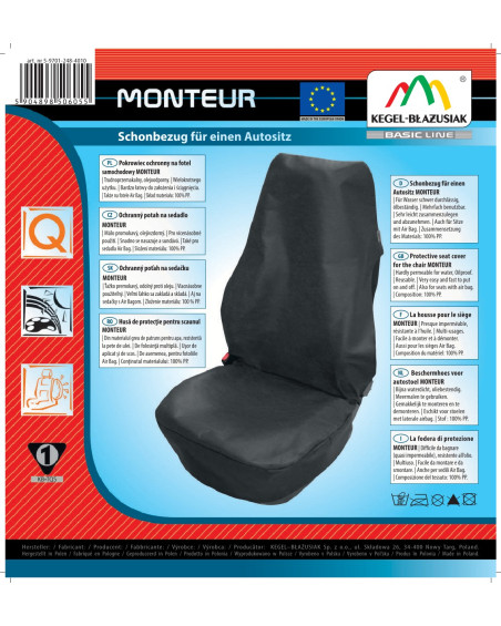 Servisný poťah MONTEUR – vyrobený z olejuvzdornej a neľahko premokavej textílie zaisťuje veľmi dobrú ochranu sedadla. Výrobok ideálny na použitie v dielňach automechanikov a v servisoch. Vyrobený preto, aby chránil čalúnenie sedadla pred nečistotami všetkého druhu a aby zabránil jeho zničeniu. Veľká plocha materiálu umožňuje zakryť celé sedadlo - sedák, operadlo, boky sedadla a opierku hlavy. Poťah je prispôsobený pre sedadlá s bočnými airbagmi. Je vyrobený v univerzálnej veľkosti, vďaka tomu sa hodí na všetky štandardné autosedadlá. Veľmi ľahko sa nasadzuje a sťahuje, jednoducho sa skladá a preváža. Lacný a dobrý výrobok!