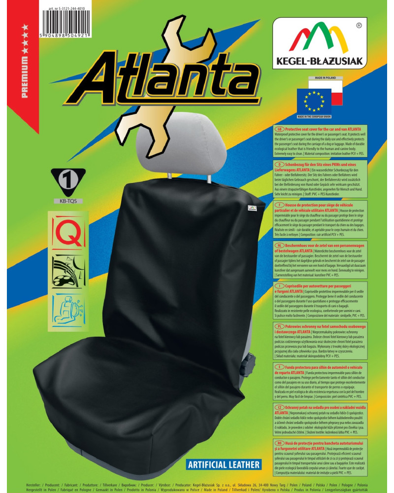 Ochranný poťah ATLANTA – z ekokože novej generácie - zaisťuje spoľahlivú ochranu sedadla. Je vyrobený z nesmierne stálej, olejuvzdornej a nepremokavej látky odolnej voči poškodeniam rôzneho typu. Vďaka správnej konštrukcii a dobrej priľnavosti materiálu poťah dobre kryje celé sedadlo a nebude sa posúvať. Špeciálne prestrihnutie poťahu umožňuje tiež vytiahnutie opierky hlavy. Je prispôsobený pre sedadlá vybavené bočnými airbagmi, čo zaisťuje bezpečné používanie. Je vyrobený v univerzálnej veľkosti, vďaka tomu sa hodí na všetky štandardné autosedadlá. Ekologický výrobok na opätovné použitie. Veľmi ľahko sa nasadzuje a sťahuje; pohodlne sa preváža, pretože po zložení nezaberie príliš miesta. Ľahko sa čistí, pretože všetky znečistenia poťahu stačí otrieť vlhkou handričkou nasiaknutou tekutinou. Pri kúpe nášho poťahu máte istotu, že získate produkt najvyššej kvality.