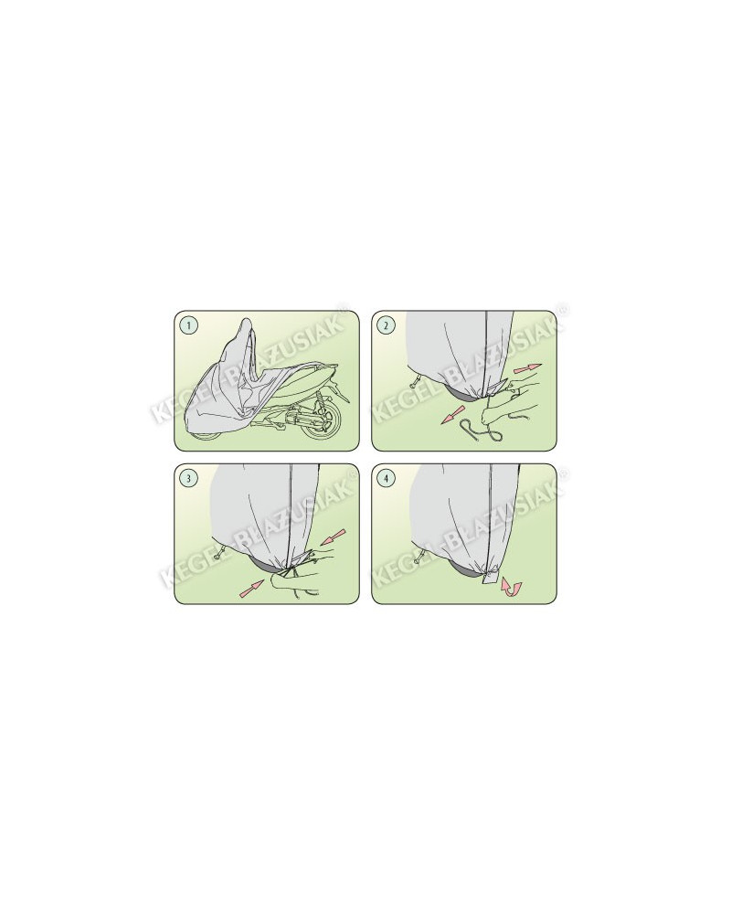 Plachta zakrýva celý povrch skútra spolu s dolnými časťami, ľahko presahuje cez spodnú časť a vďaka sťahovaču s lankom okolo celého vozidla sa pevne prichytí k autu, čo zabraňuje posúvaniu plachty. Iba správne zaviazanie zaručuje odolnosť viazania. Po zložení plachta nezaberie príliš miesta, vďaka tomu ju môžete voziť so sebou.