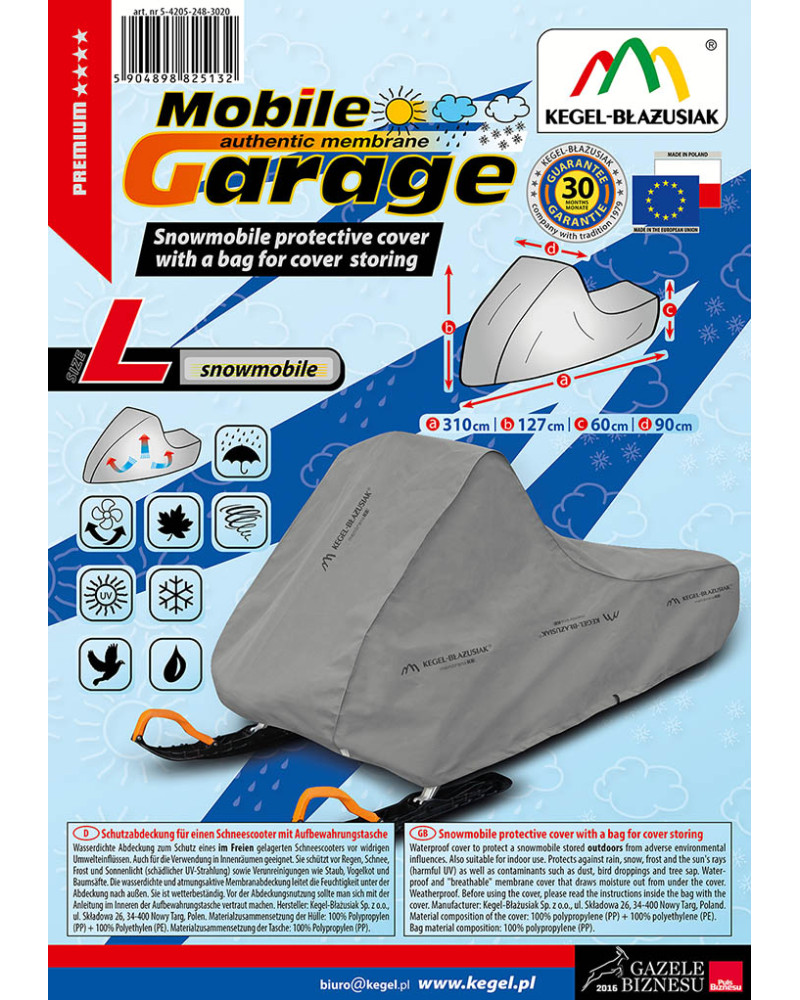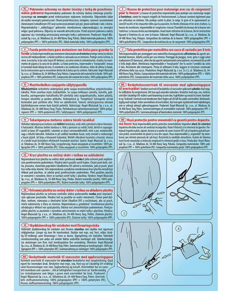 Nepremokavá plachta na ochranu snežného skútra parkovaného vonku pred nepriaznivým vplyvom prostredia. Vhodná tiež na použitie vo vnútri miestností. Chráni pred dažďom, snehom, námrazou a slnečnými lúčmi (škodlivé UV) a nečistotami, ako sú prach, vtáčie exkrementy a šťavy zo stromov. Nepremokavá a „priedušná“ membránová plachta odvádzajúca vlhkosť von spod plachty. Odolná voči atmosférickým podmienkam.